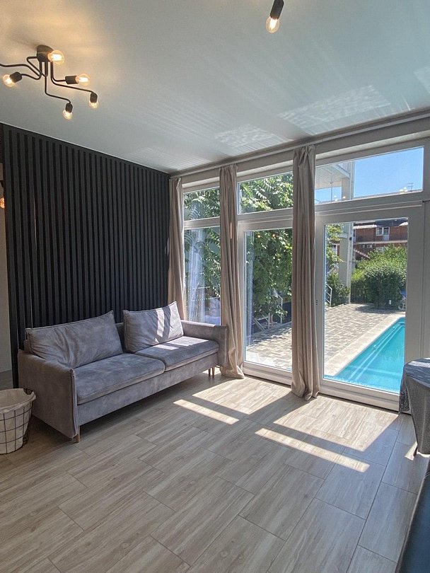 В распоряжении гостей на территории открытый бассейн с чистой водой и мангальная зона для приготовления блюд на свежем воздухе. Также отдыхающие могут посетить банный комплекс, расслабиться в джакузи или купели, насладиться яркими красками и ароматами цветов в саду гостевого дома.
