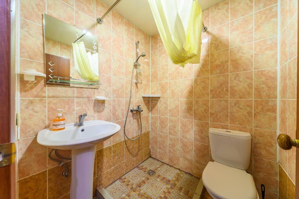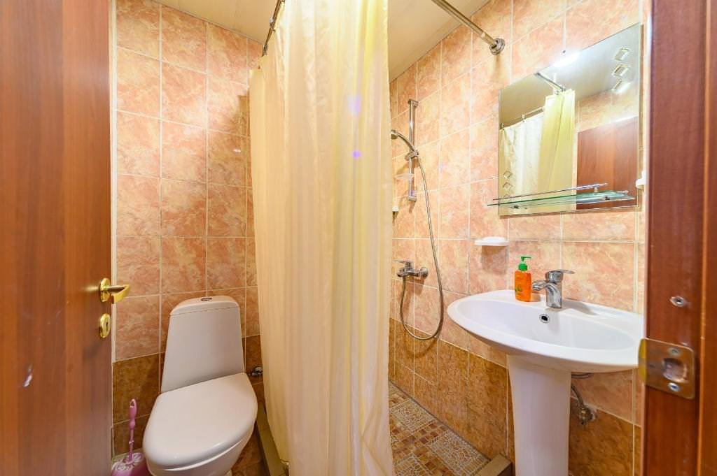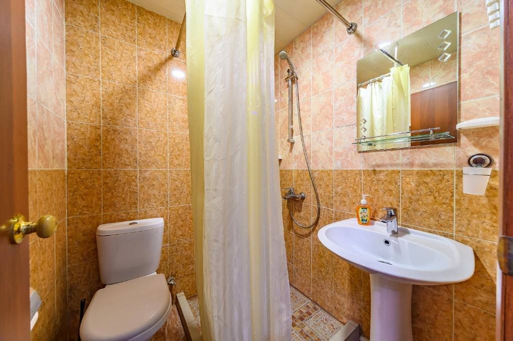 Индивидуальная ванная комната: душ, раковина, туалет.