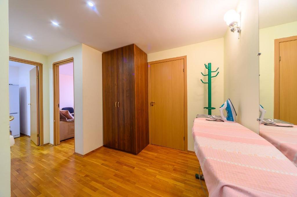 Имеется сейф, телевизор, кондиционер, отопление, шкаф, вешалка, обеденный стол, рабочий стол, журнальный столик, кухня, посуда, столовые приборы, СВЧ, чайник, холодильник, газовая плита, духовой шкаф, стулья, стиральная машина, сушилка для белья, утюг, гладильная доска, фен.