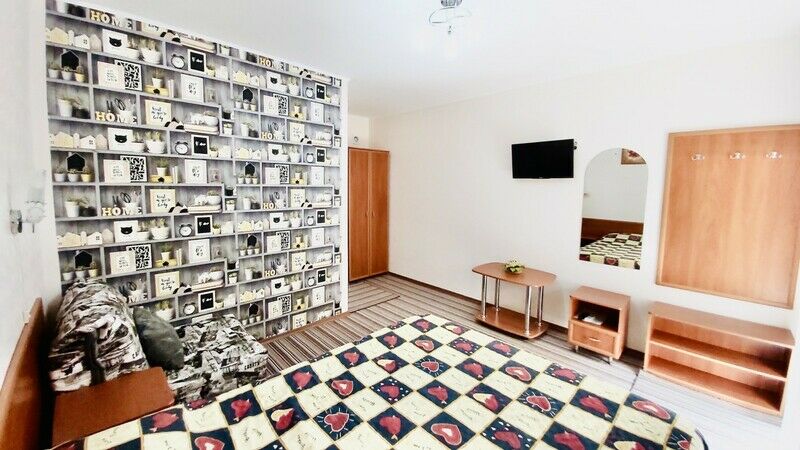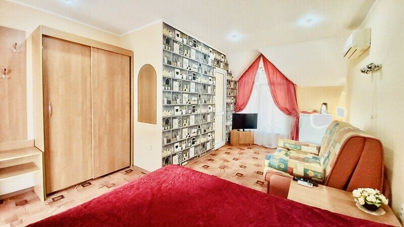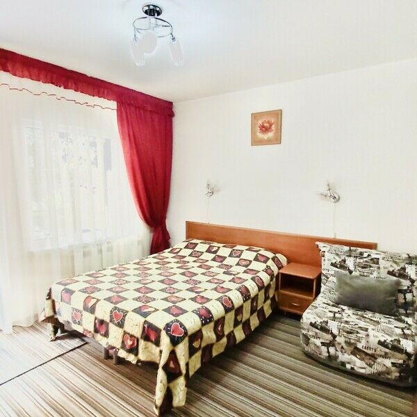 Комната с 1 кроватью и с раскладным диваном (возможно два дополнительных места) со всеми удобствами.