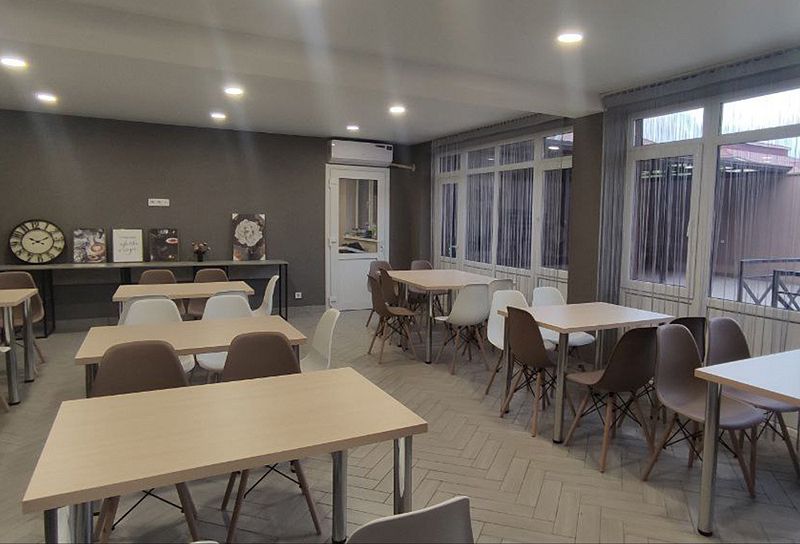 На первом этаже расположена кухня для самостоятельного приготовления пищи. Просторный зал со столиками, для комфортного пребывания в жаркое время года оборудован кондиционером.