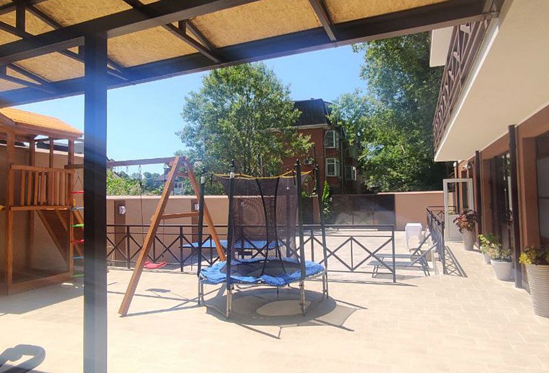 На территории дома есть беседка с мангалом, детская площадка, спортивный зал, каркасный бассейн. Для самостоятельного приготовления пищи, помимо мангала, можно воспользоваться общей кухней.