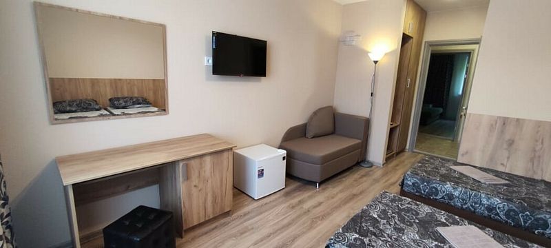 Имеется телевизор, кондиционер, отопление, шкаф, вешалка, стулья, холодильник, фен.