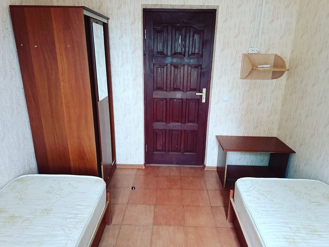 В номере имеются две односпальные кровати, телевизор, кондиционер, шкаф, вешалка, журнальный столик и стулья. Общие удобства включают ванную комнату, душ и туалет.