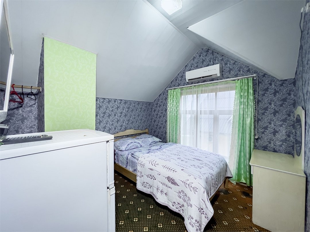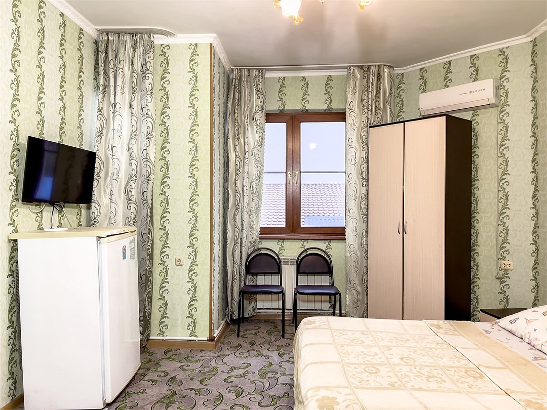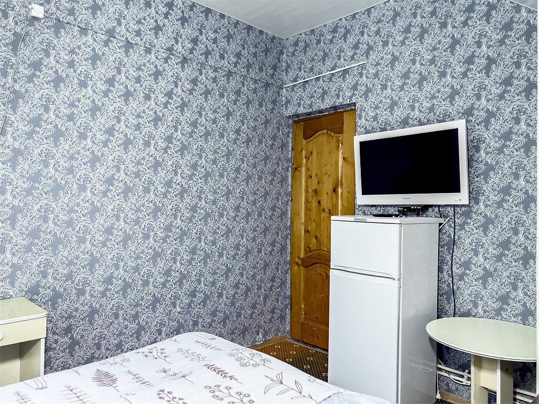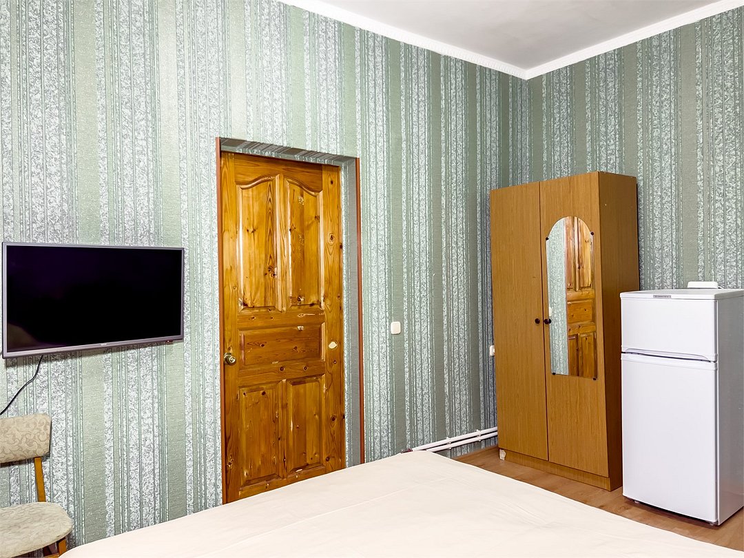 телевизор, Wi-Fi, холодильник, кондиционер, фен, односпальная кровать, шкаф для одежды, чайник, общая ванная комната, вид во двор, стул, тумба, туалетные средства, санузел на этаже, цифровое тв, вешалки-плечикиВ гостиничном номере