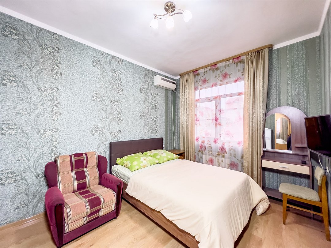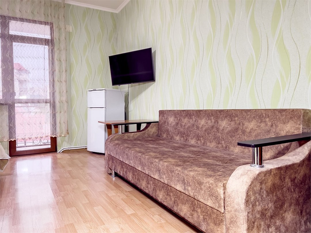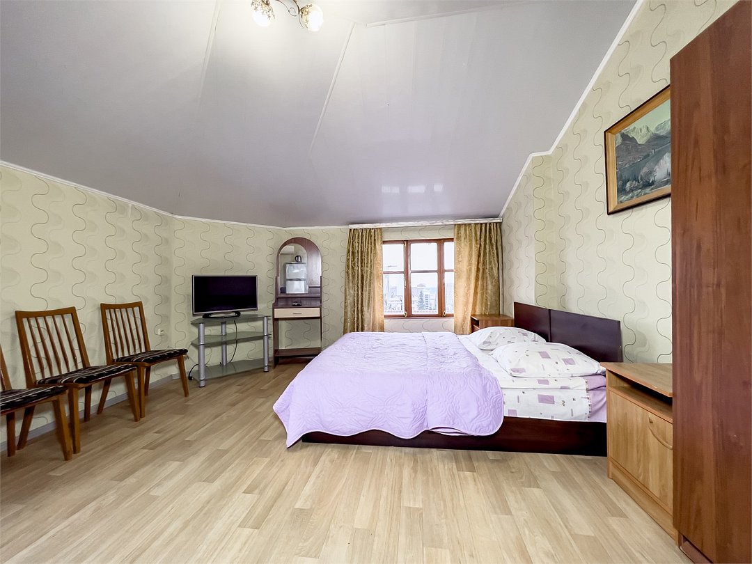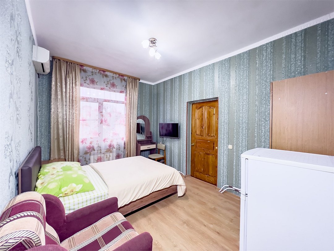 телевизор, Wi-Fi, холодильник, кондиционер, фен, санузел, банные принадлежности, банные полотенца, кровать «King size», тумбы, стулья, шкаф для одежды, вешалки, зеркало, чайник, душ, вид на город, вид во двор, ламинат, стол, туалетные средства, туалет, цифровое тв, москитная сетка, номер для некурящих, двуспальный раскладной диван-кровать, вешалки-плечики, мылоВ гостиничном номере