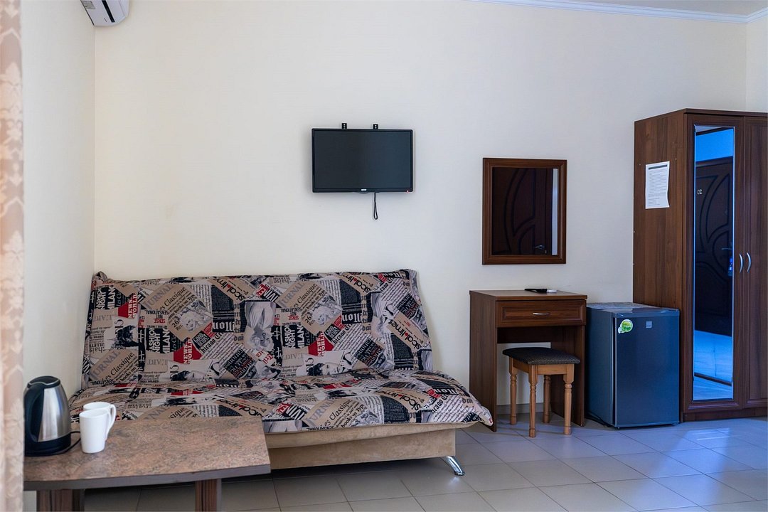 Номер «Стандарт» — оптимальное решение для тех, кто решил отдохнуть в Сукко, не переплачивая за жильё. Помимо привлекательной цены, этот номер обладает всем необходимым. В нём есть все для комфортного отдыха: отдельный санузел, сплит-система, холодильник и телевизор. «Стандарты» бывают с двумя типами кроватей: двумя односпальными или одной двуспальной. Также в номере есть диван, который тоже раскладывается, шкаф и столик. Из окна открывается прекрасный вид на местные красоты. «Стандарт» — сочетание цены и качества. Он подходит для долгого и краткосрочного отдыха, а цены на них остаются приемлимыми даже в сезонУслуги и удобства