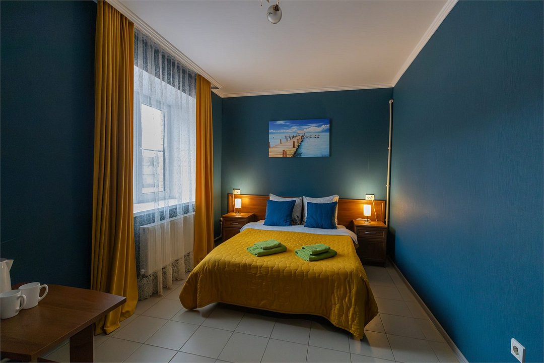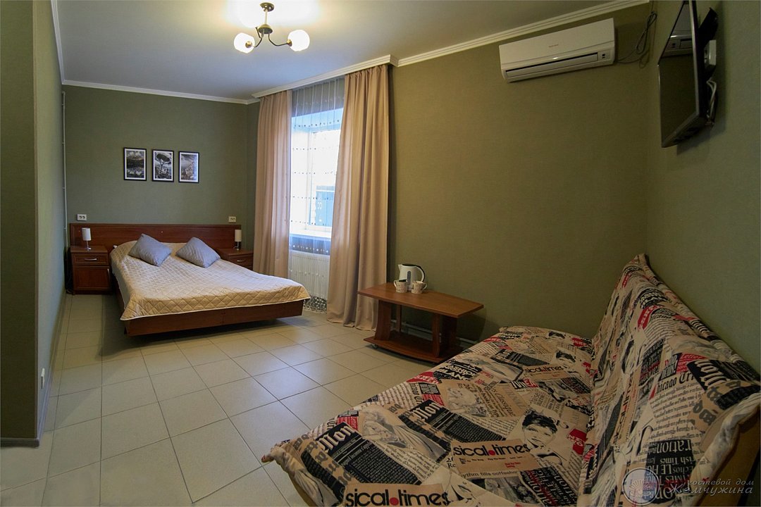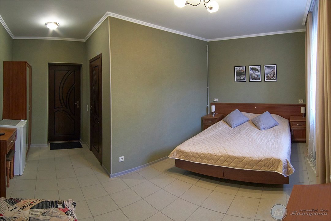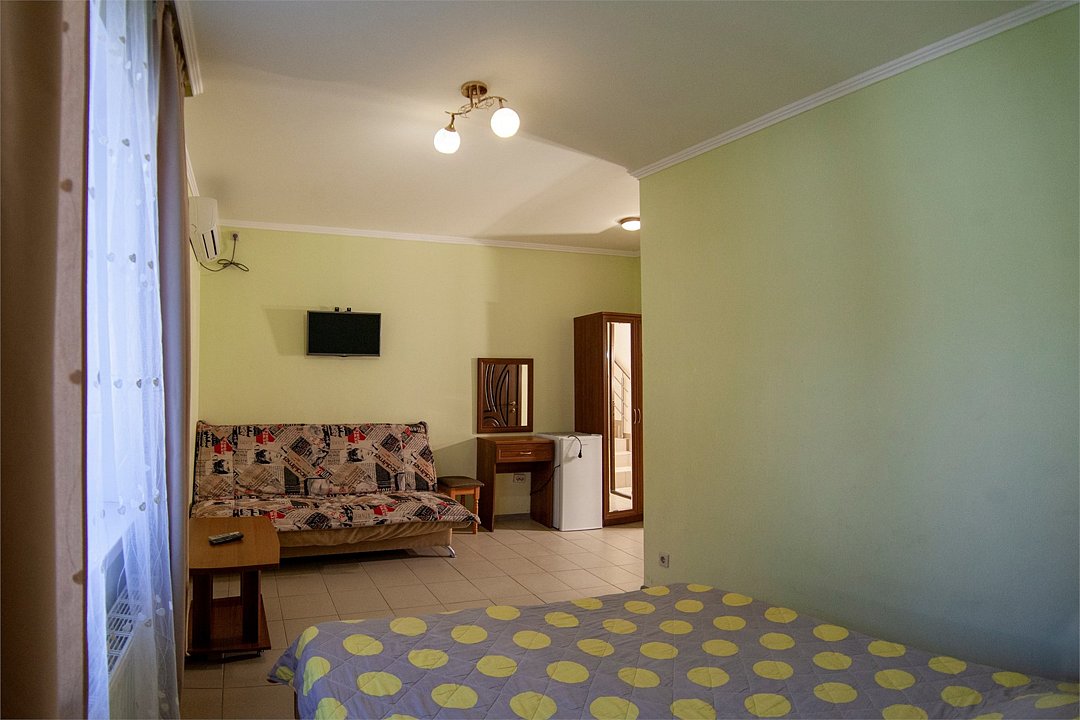 Если вы хотите отдохнуть в Сукко с комфортом и не везти с собой полдома, номер «Делюкс» — то, что надо. В нём есть всё для комфортного отдыха: холодильник, чайник и чайная пара, фен, телевизор. В «Делюксе» большая двуспальная кровать, на которую так приятно прилечь после насыщенного дня. Если гостей больше, чем двое — не проблема. В номере есть диван, который раскладывается, так что ещё двое могут разместиться. Условия подходят для длительного отдыха, командировок и отдыха даже с самыми маленькими детьми. Есть отдельный санузел, сплит и отопление, которое можно включить, если станет холодно. Свежий евроремонт, вся необходимая мебель, бытовая техника — мы постарались сделать номер «Делюкс» по-домашнему удобным, чтобы вы могли расслабиться и насладиться отдыхом.Услуги и удобства