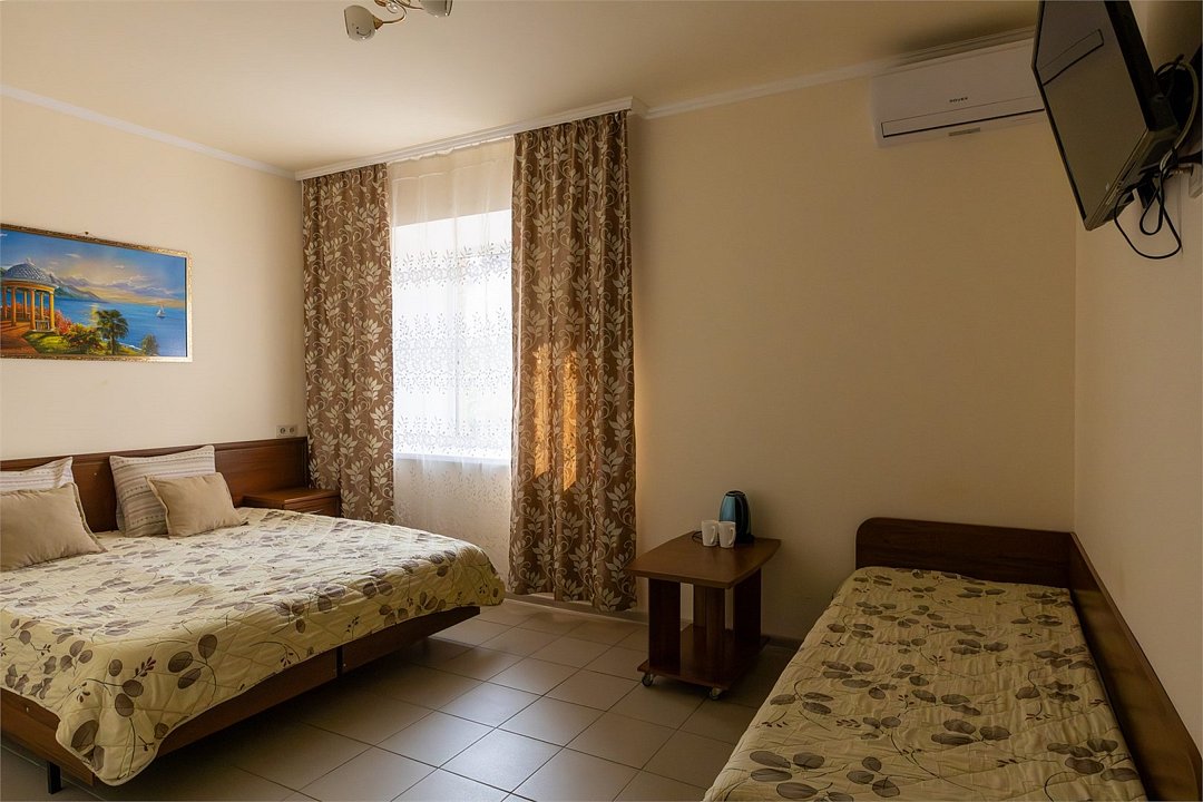Номер «Семейный» в Сукко — удобный и экономичный вариант для размещения семьёй или большой компанией. В номере две комнаты, вместимость номера — до пяти человек. Вы можете выбрать вариант с отдельными кроватями или сочетанием дивана и кресла-кровати. Во второй комнате по умолчанию стоит большая двуспальная кровать. У каждого номера свой санузел, в комнатах установлены сплит-системы, чтобы проживание в них было комфортным. Также для удобства гостей в номере есть холодильник, ЖК телевизор и вся необходимая мебель. Все номера очень уютные, светлые.Услуги и удобства