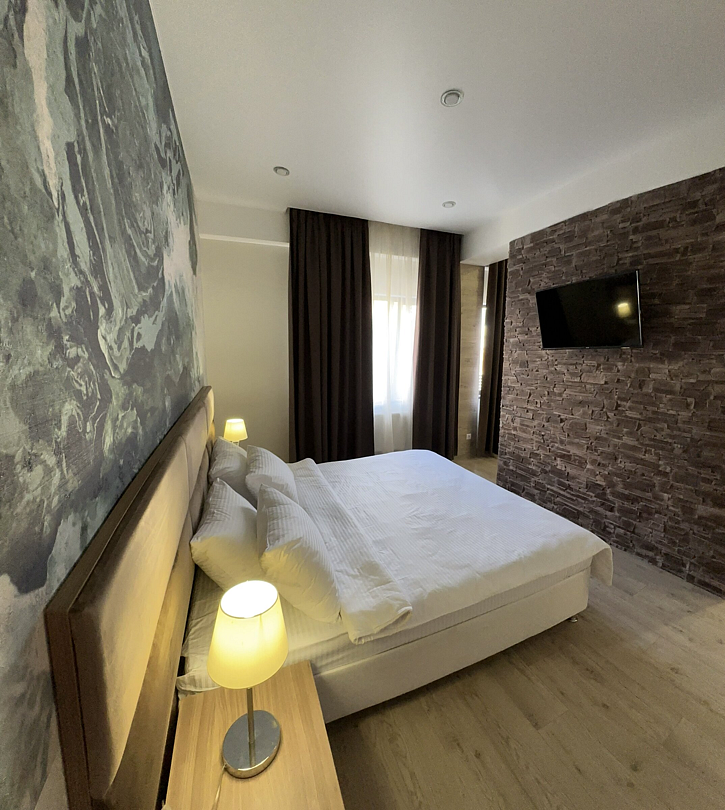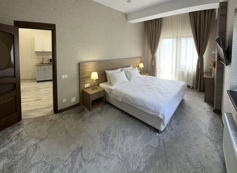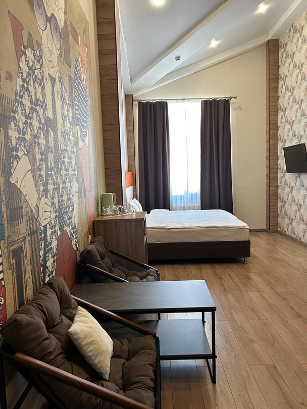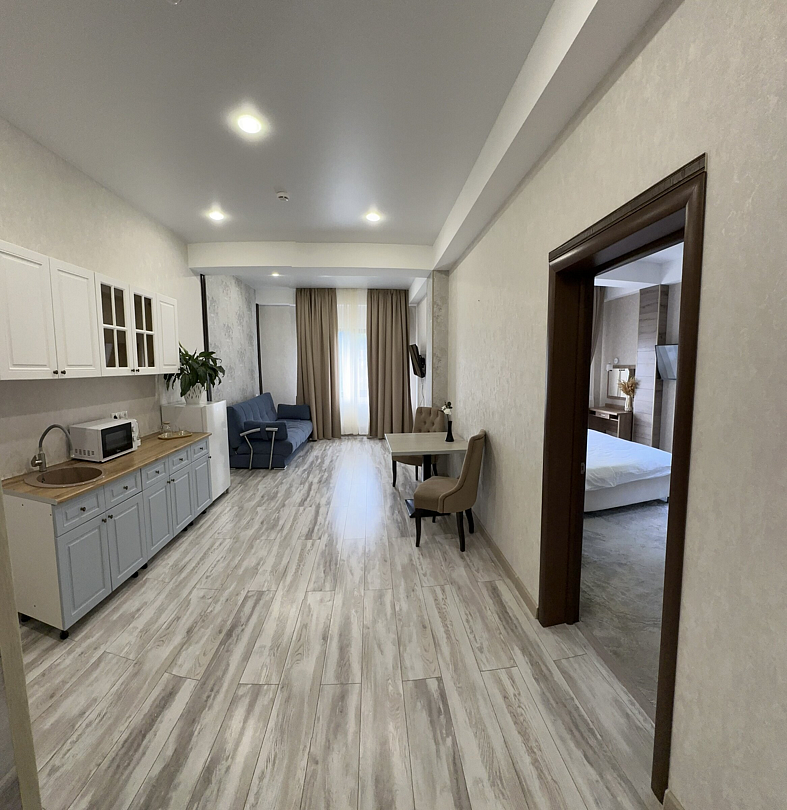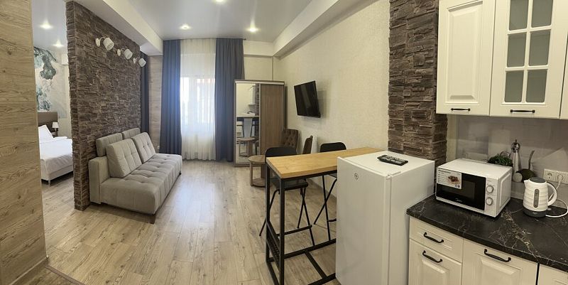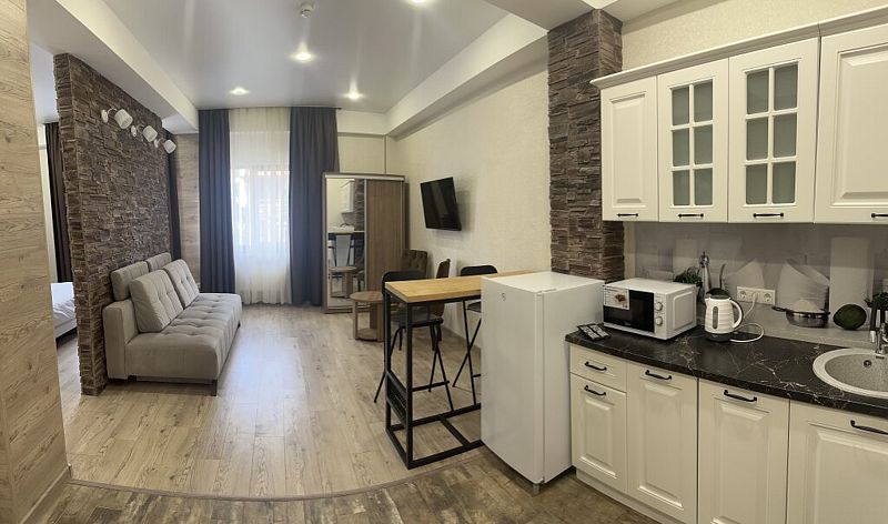 Комфортный однокомнатный номер с большой двуспальной кроватью и раскладным диваном. Номер с мини кухней.