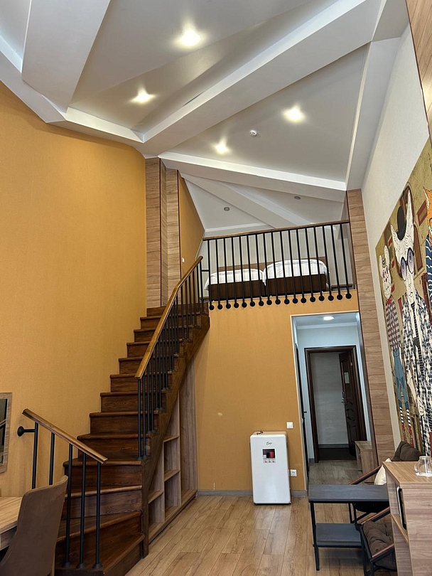 Комфортные двухуровневые апартаменты с дизайнерским ремонтом. На первом этаже большая двуспальная кровать, на втором две односпальные кровати. Отличный вариант для комфортного проживания компании до 4-х человек. В номере: телевизор, микроволновая печь, электрочайник, холодильник, посуда. Санузел оснащён душевой кабиной. В наличии фен, базовые косметические средства, полотенца, тапочки. На территории дома есть большая открытая парковка, и комната для хранения горнолыжного оборудования.