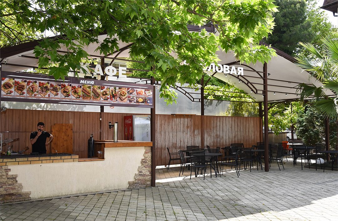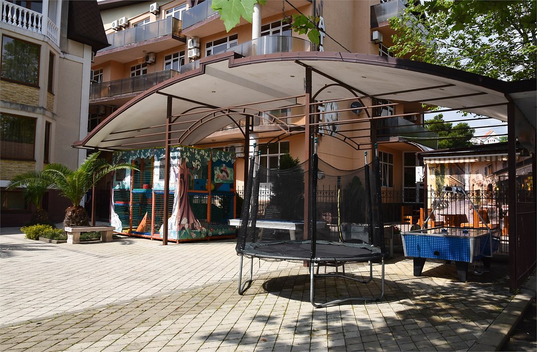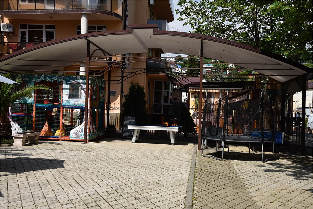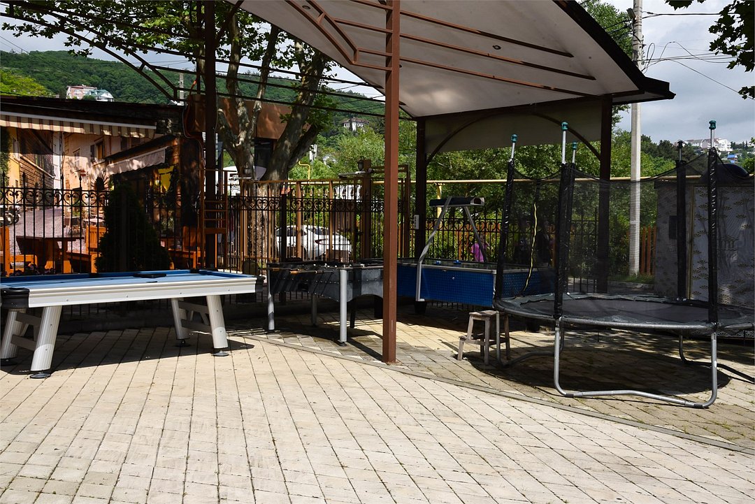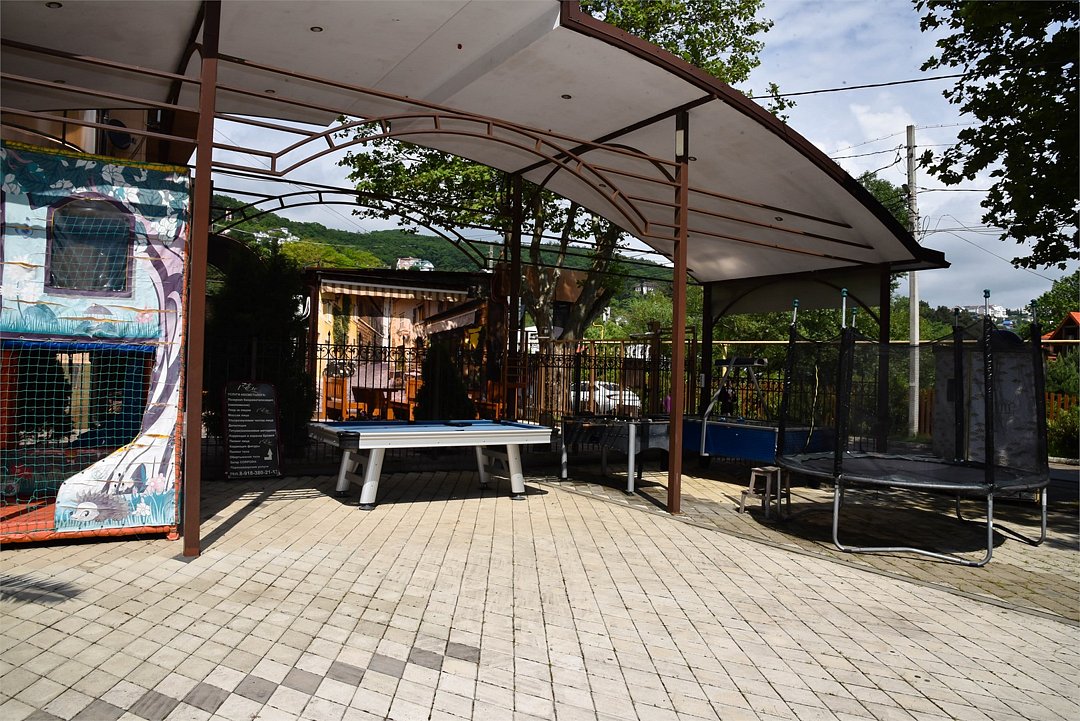 Облагороженная территория, имеется общая кухня, летнее кафе с кавказской кухней (блюда на мангале). На территории комплекс развлечений для детей и взрослых: мини бильярд, аэрохоккей, детский лабиринт, батут для детей.