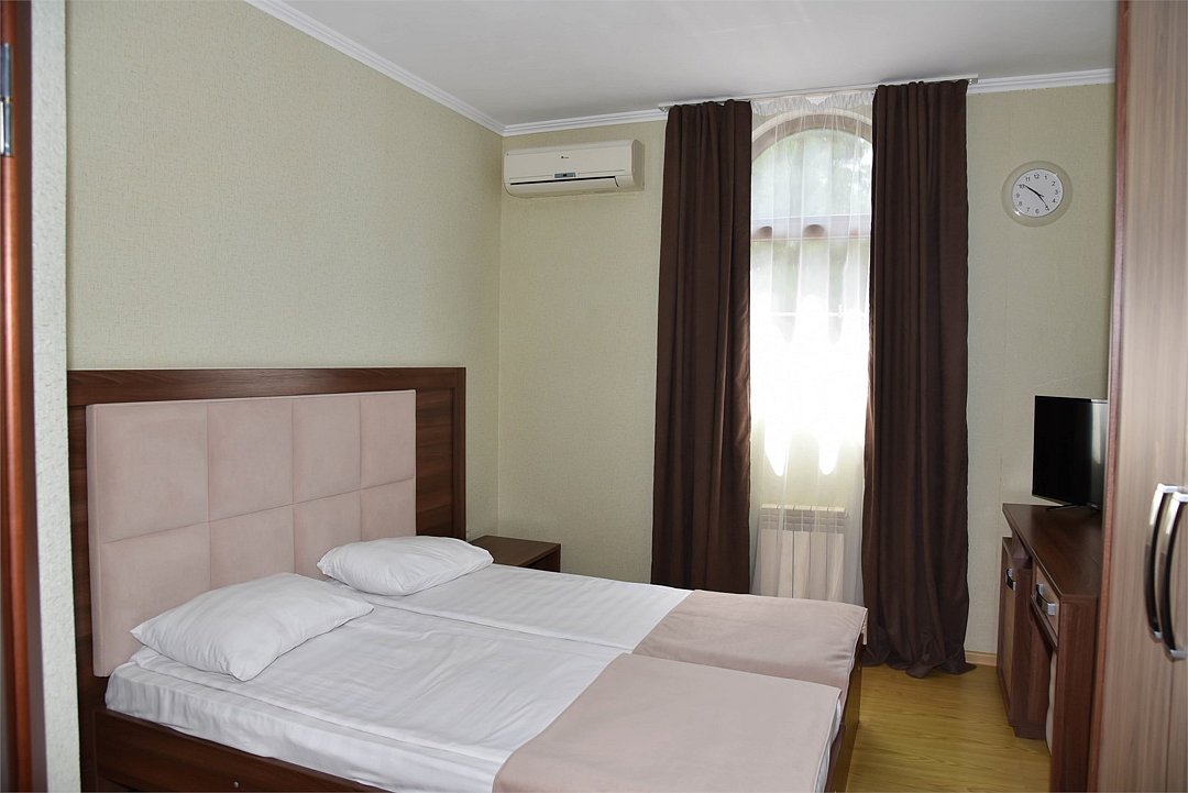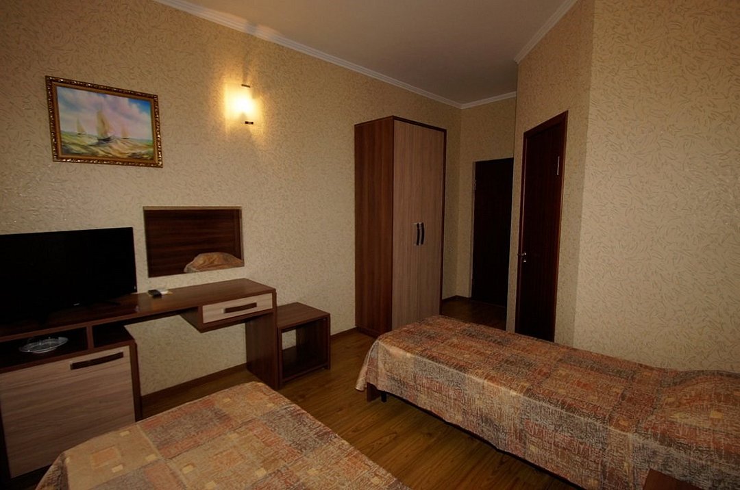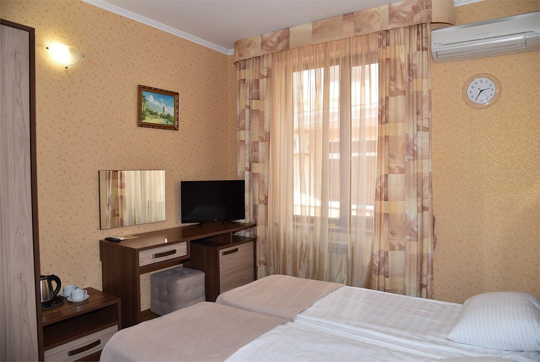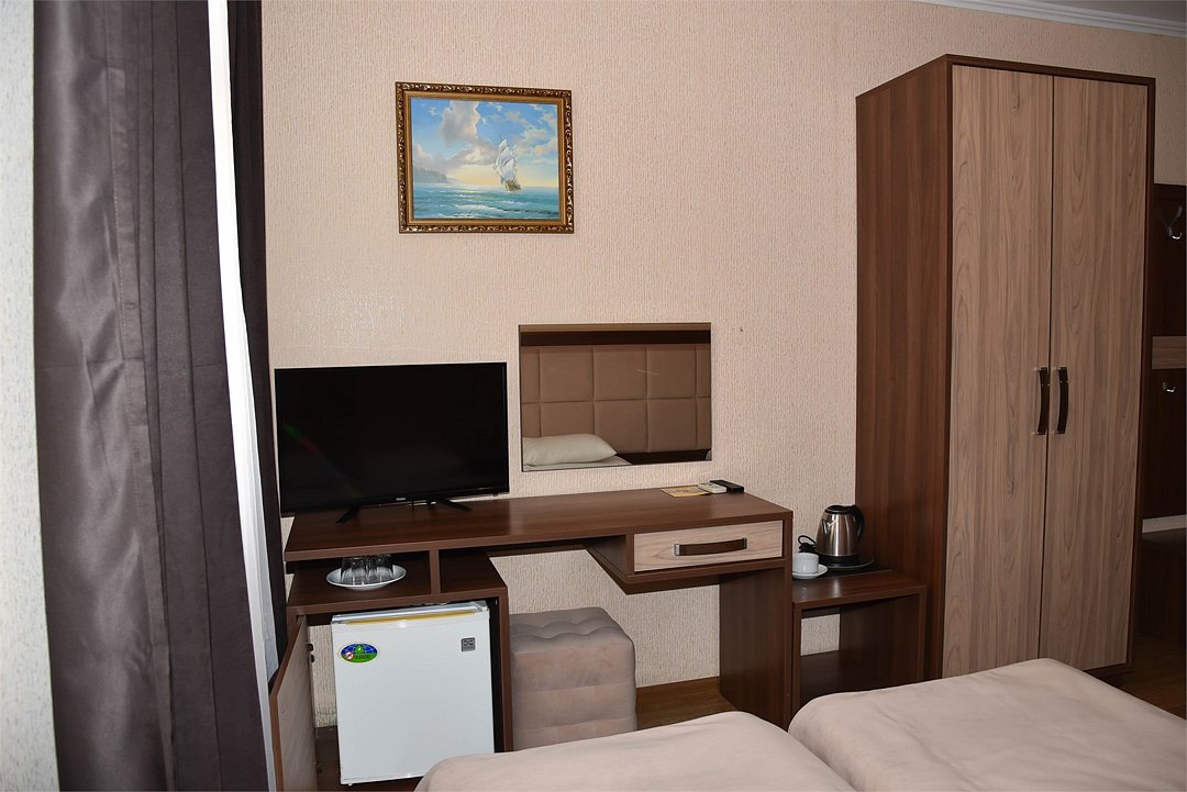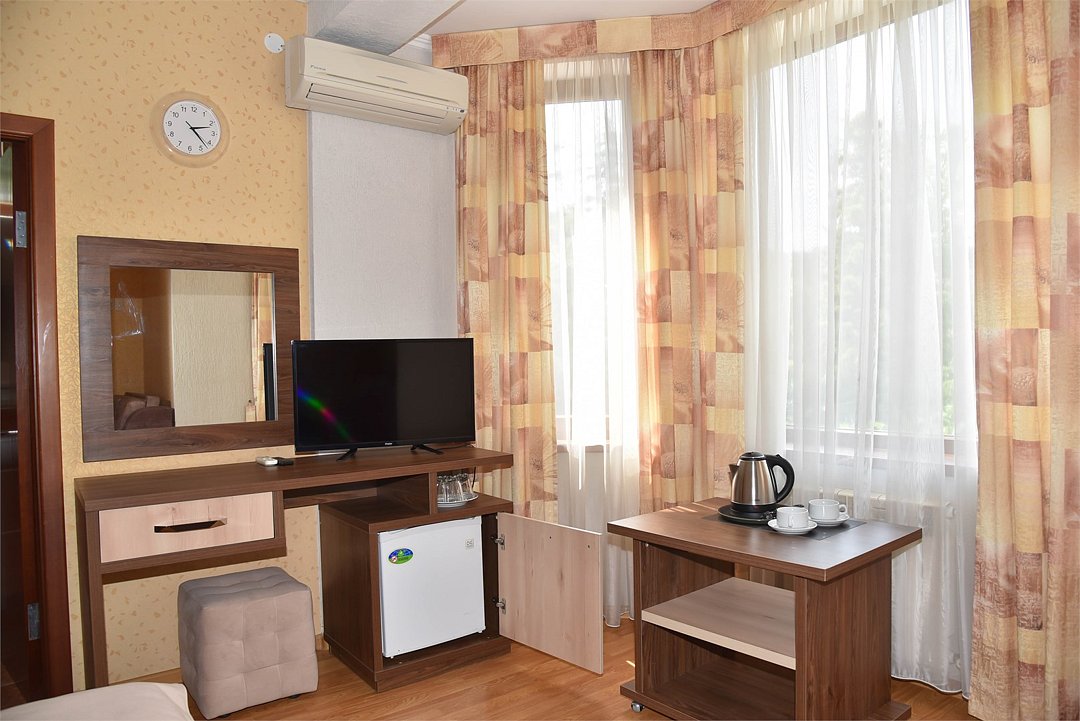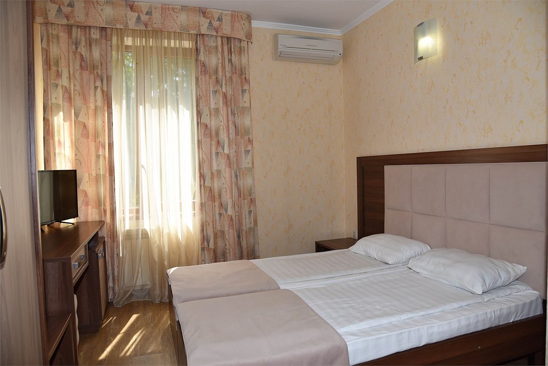 Две раздельные кровати, тв, кондиционер, с/у, душ., мини-холодильник, , шкаф, тумбочки, журнальный столик, санузел в номере, без балкона.