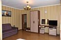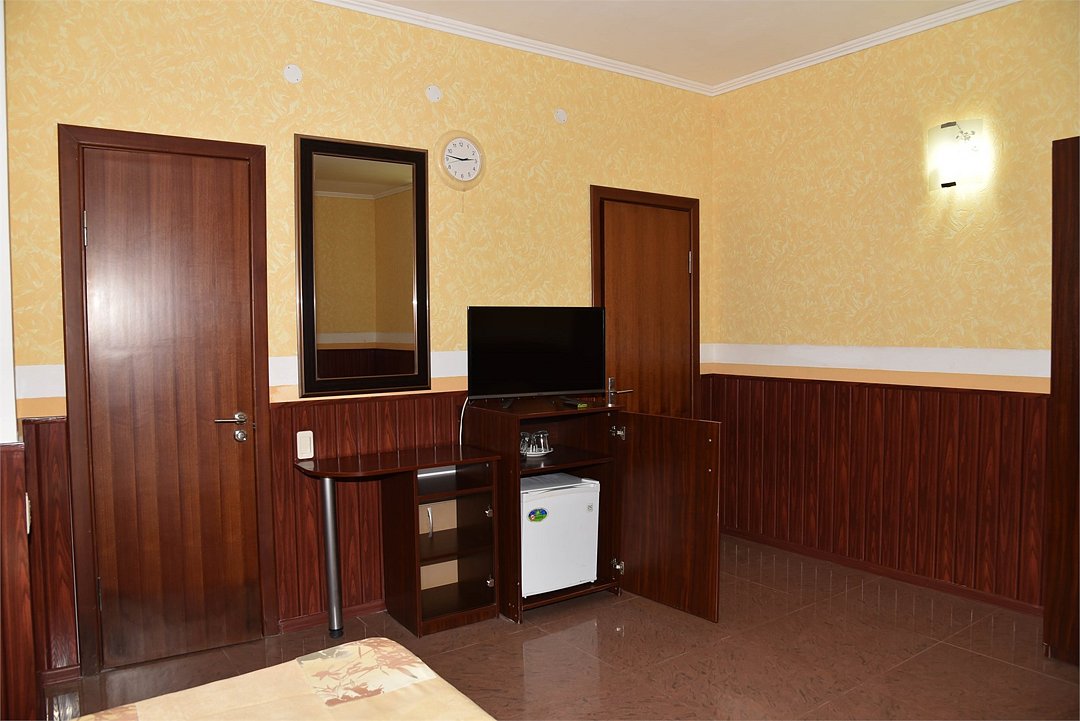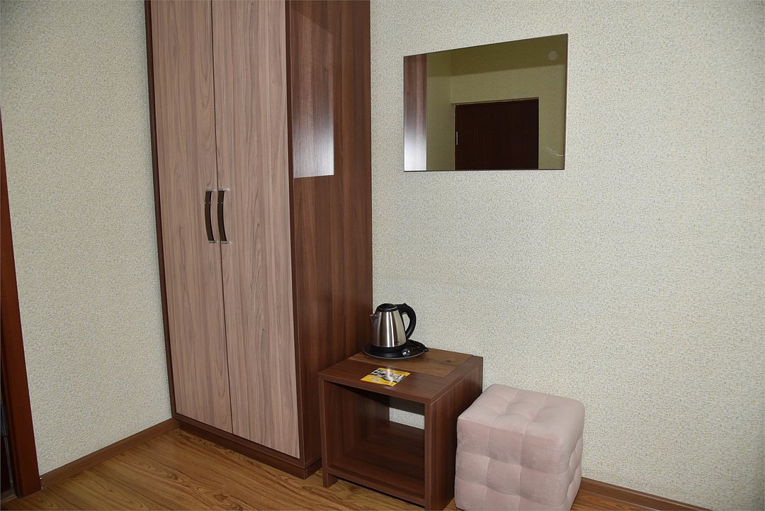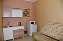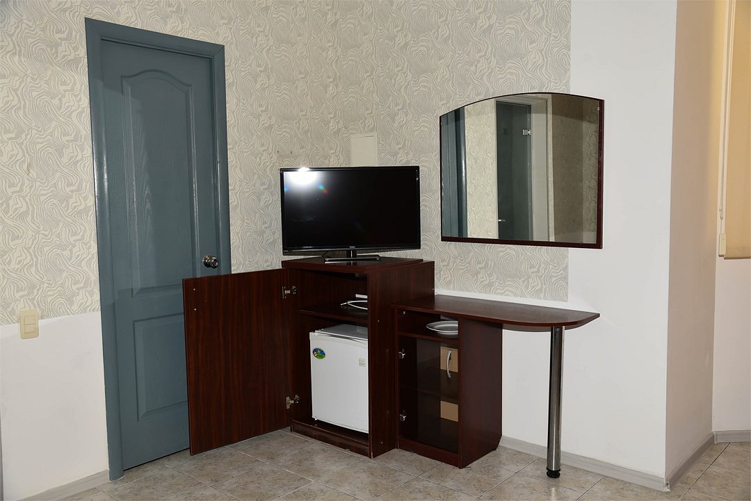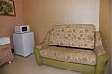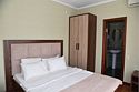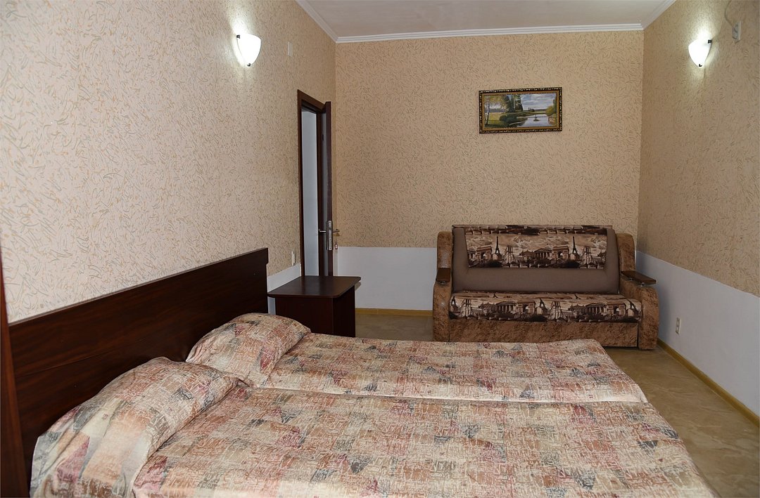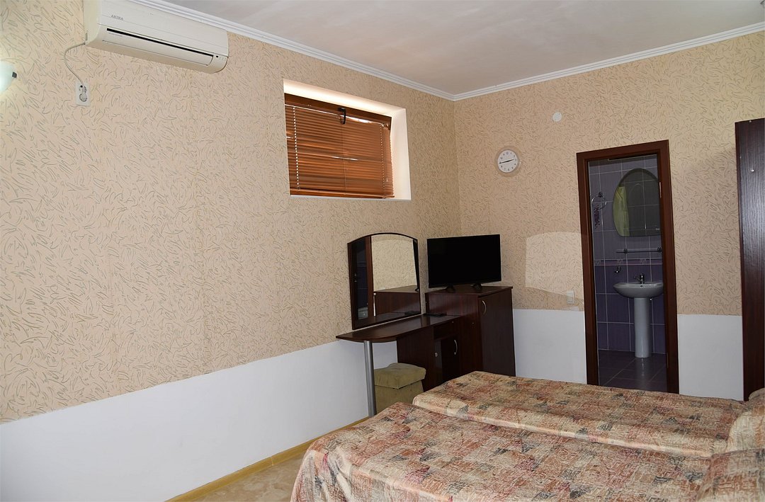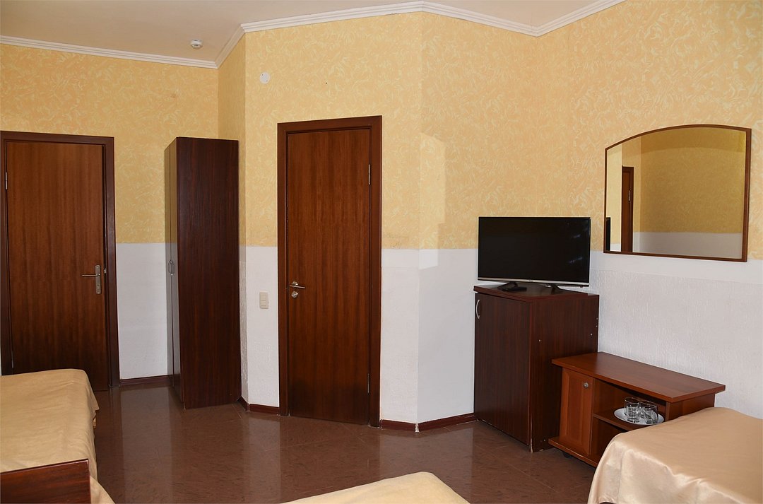 Двухместный номер с двуспальной кроватью. В номере телевизор, мини-холодильник, кондиционер, шкаф, тумбочки,журнальный столик. Санузел в номере(душ). Без балкона.Трехместный номер "Полу-цоколь"