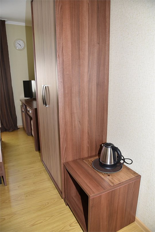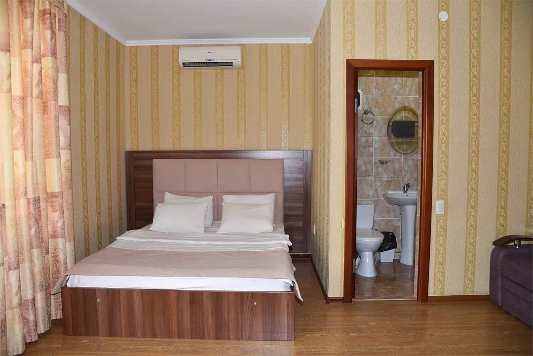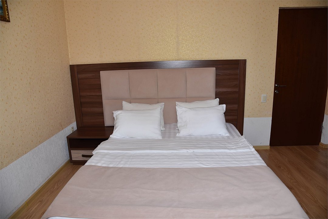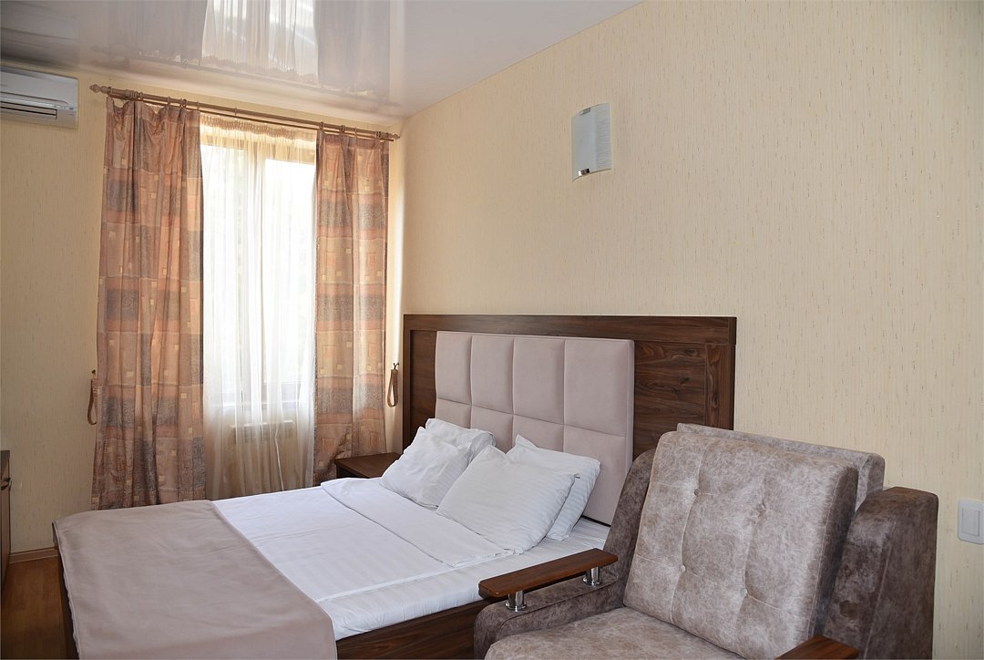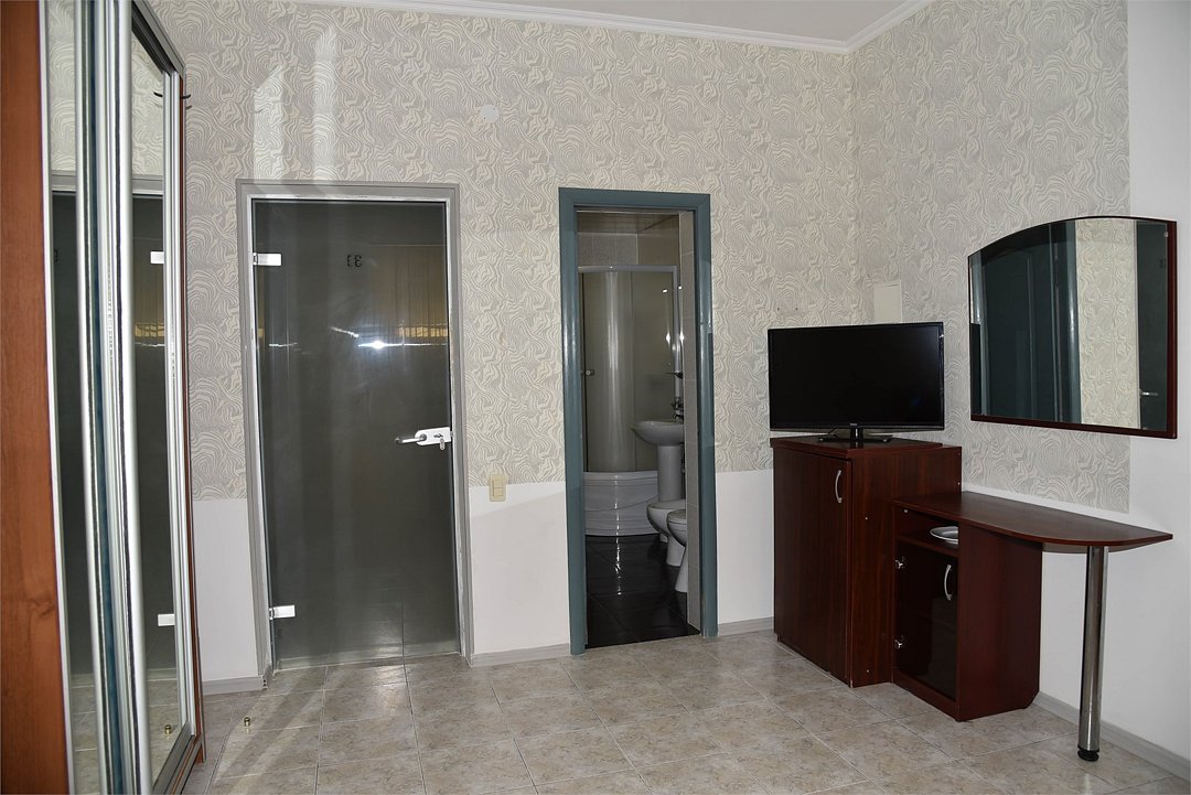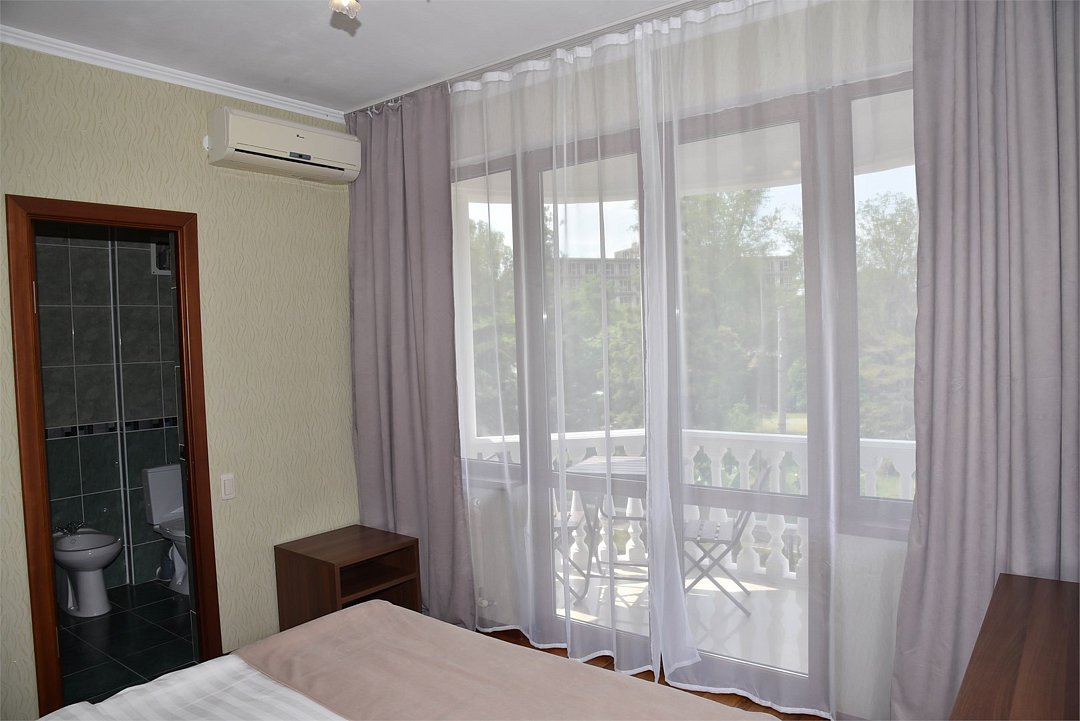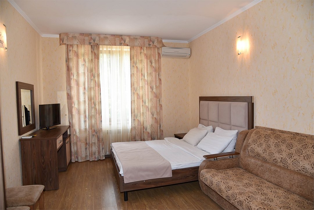Двухместный номер с двуспальной кроватью. В номере телевизор, мини-холодильник, кондиционер, шкаф, тумбочки,журнальный столик. Санузел в номере(душ). Без балкона.Трехместный номер "Полу-цоколь"