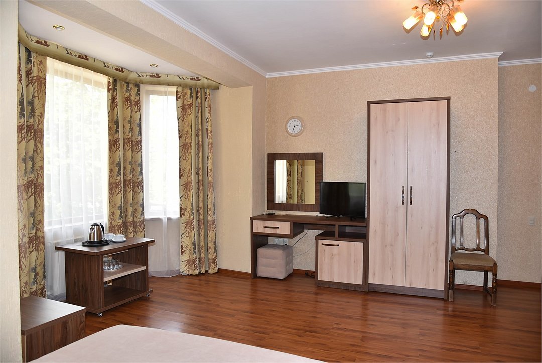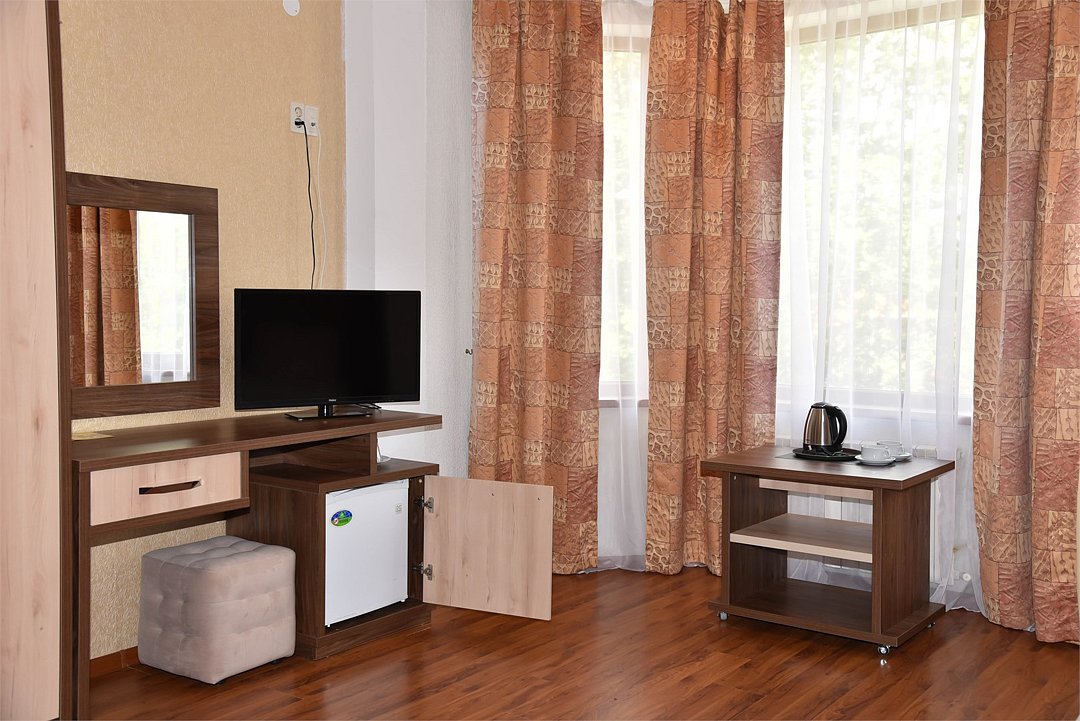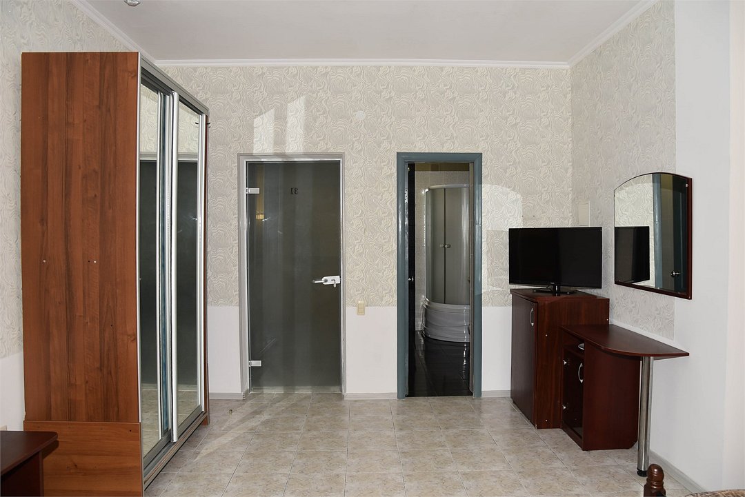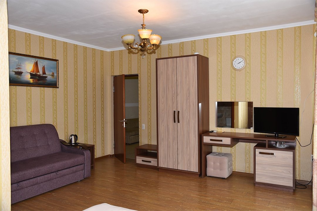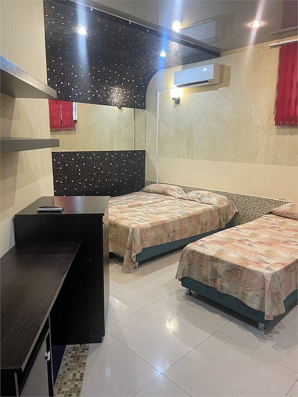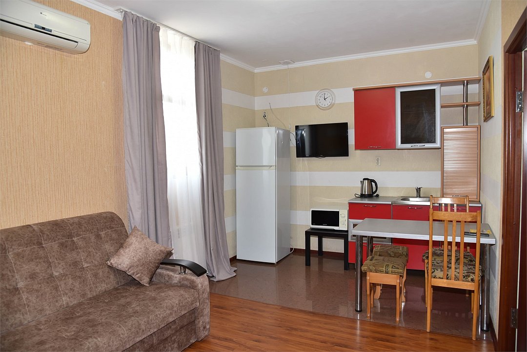 В номере двуспальная кровать, три односпальных кровати,телевизор, мини-холодильник,кондиционер, шкаф, журнальный столик,санузел в номере( душ).Двухкомнатный номер с мини-кухней