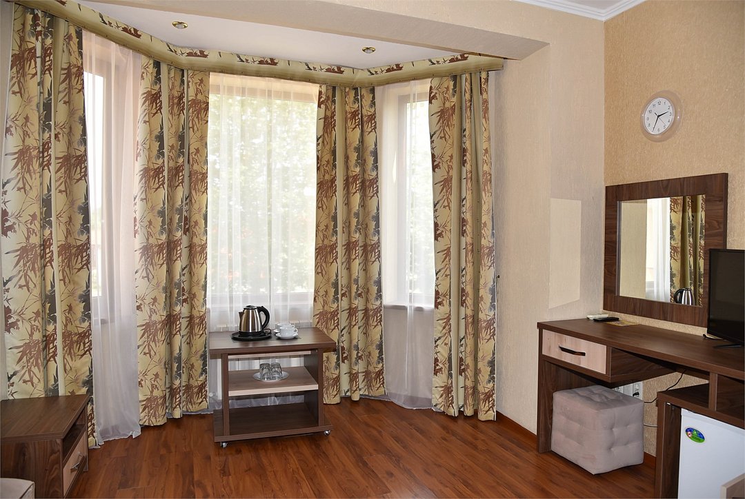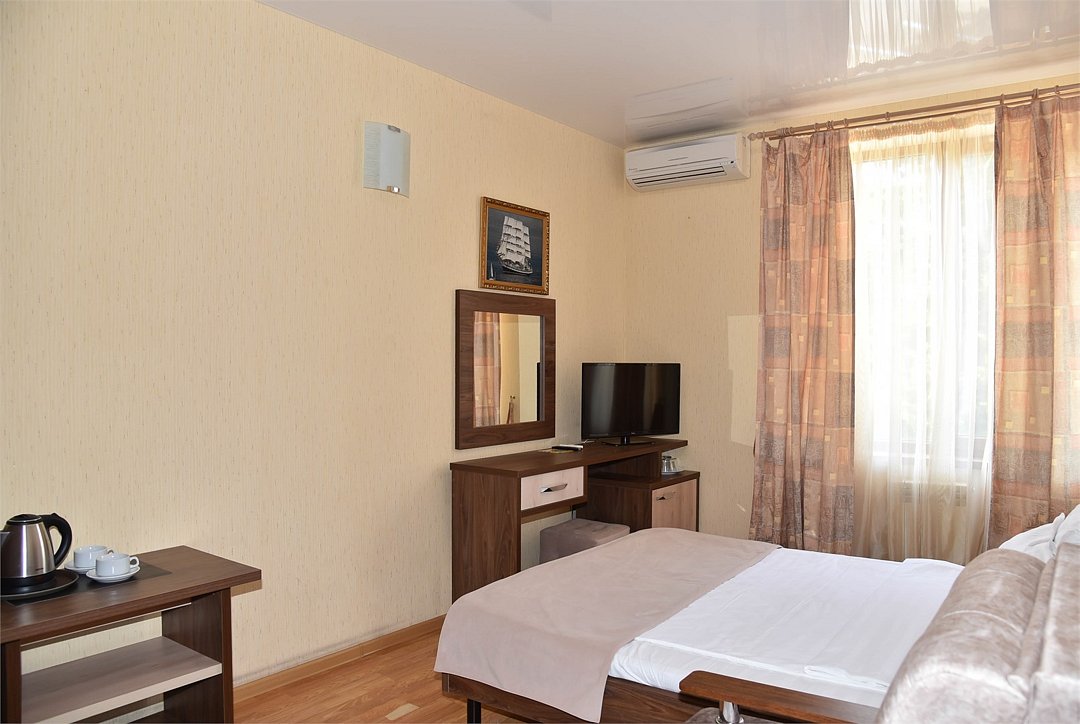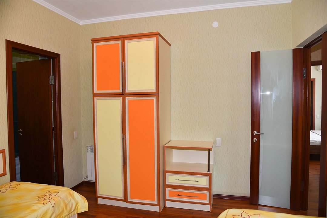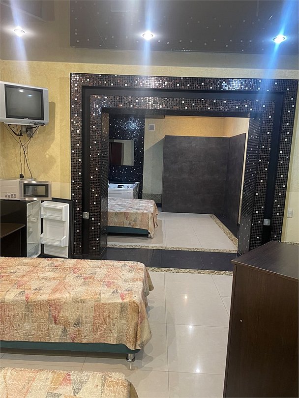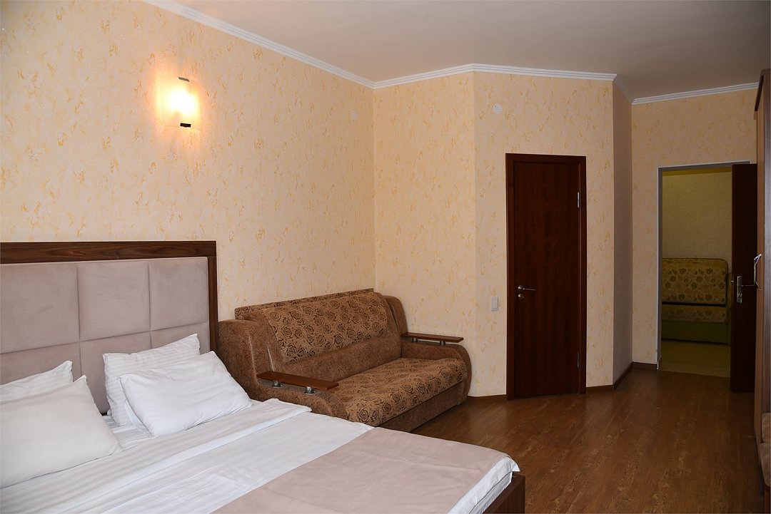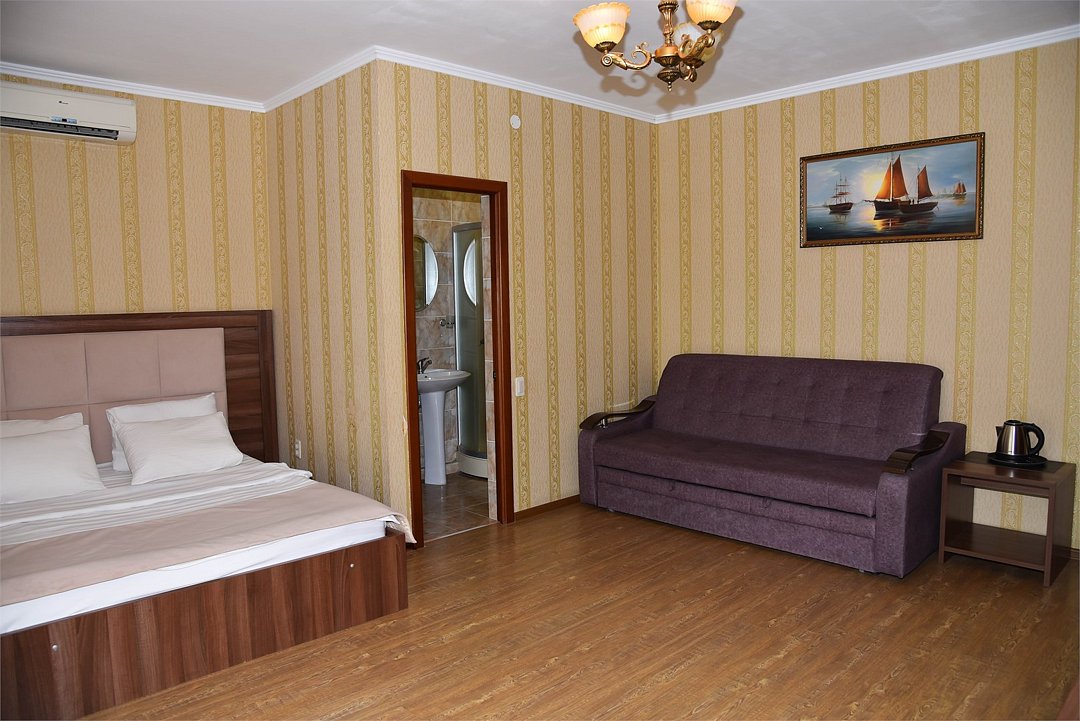 В номере двуспальная кровать, три односпальных кровати,телевизор, мини-холодильник,кондиционер, шкаф, журнальный столик,санузел в номере( душ).Двухкомнатный номер с мини-кухней