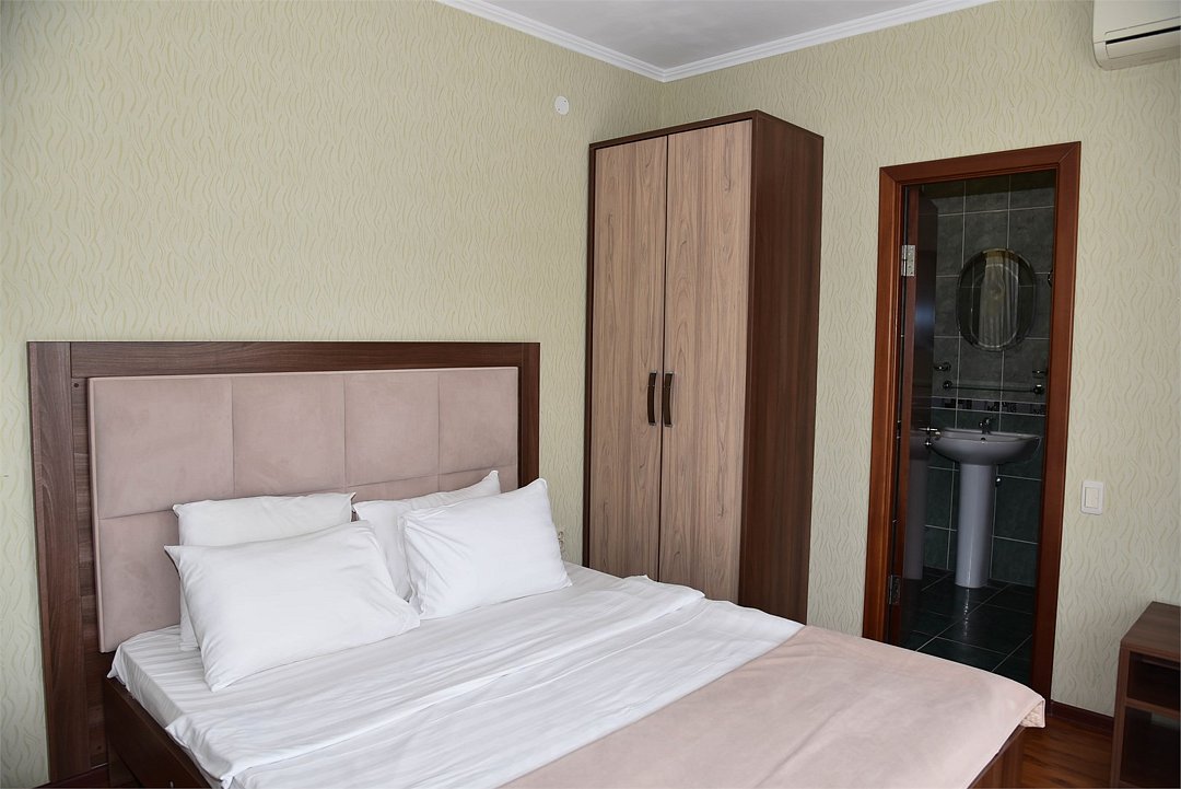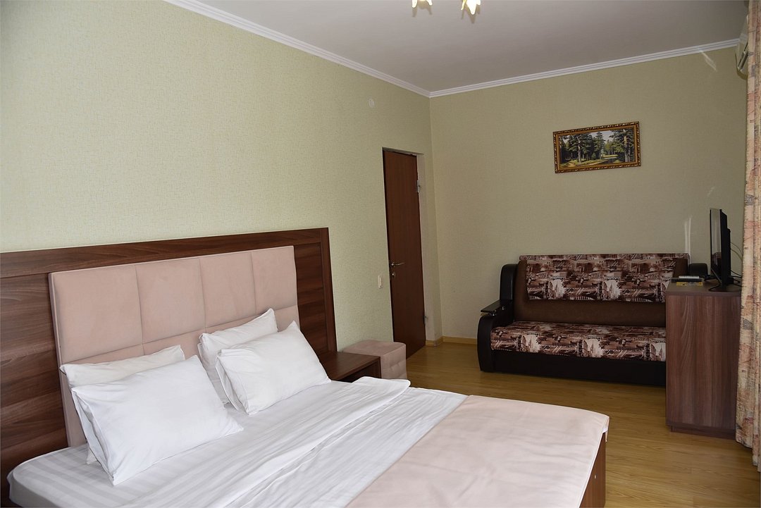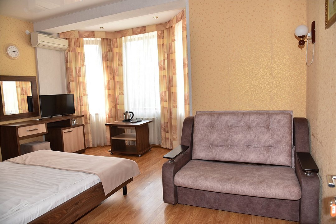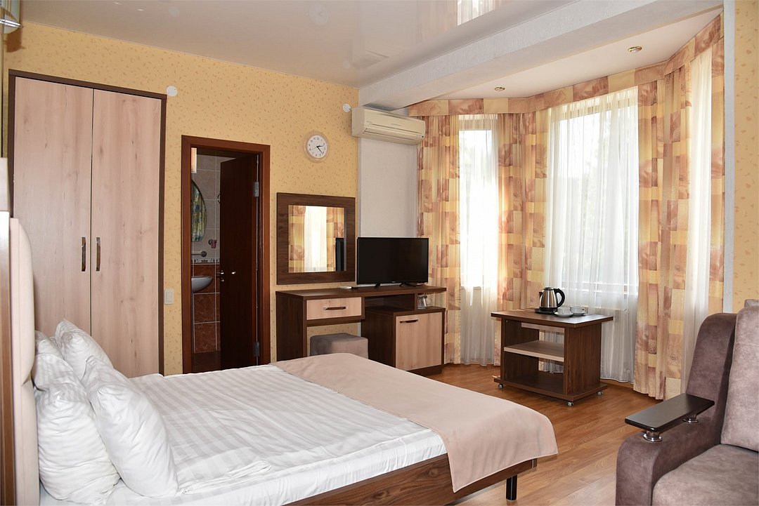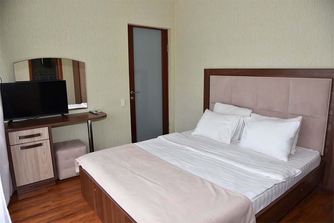 В номере двуспальная кровать, три односпальных кровати,телевизор, мини-холодильник,кондиционер, шкаф, журнальный столик,санузел в номере( душ).Двухкомнатный номер с мини-кухней