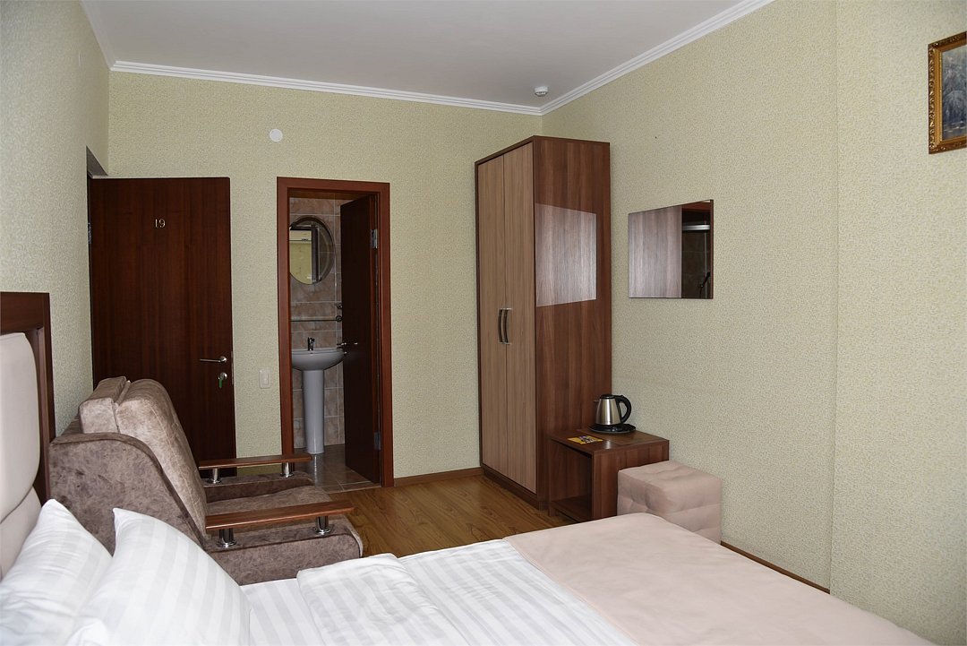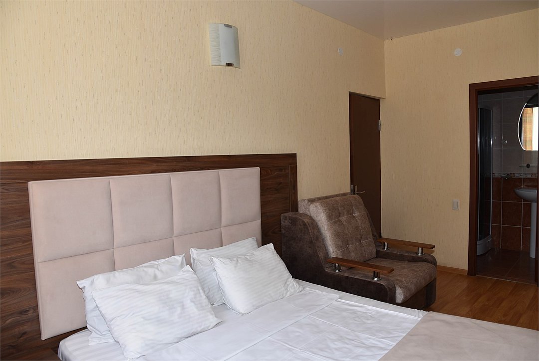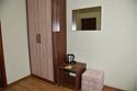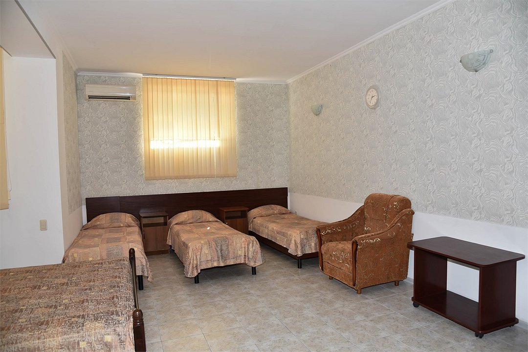 В номере три односпальные кровати,телевизор, мини-холодильник,кондиционер, шкаф,тумбочки,журнальный столик. Санузел в номере(душ).Трехместный номер с креслом
