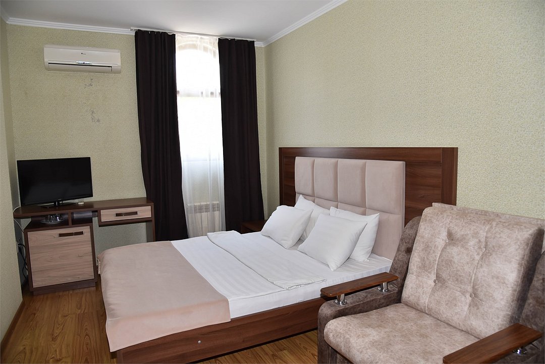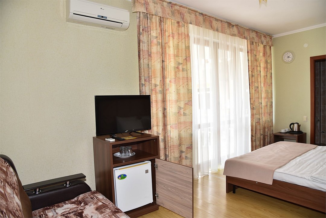 Двуспальная кровать, раскладное кресло. В номере телевизор, мини-холодильник, кондиционер, с/у, душ.