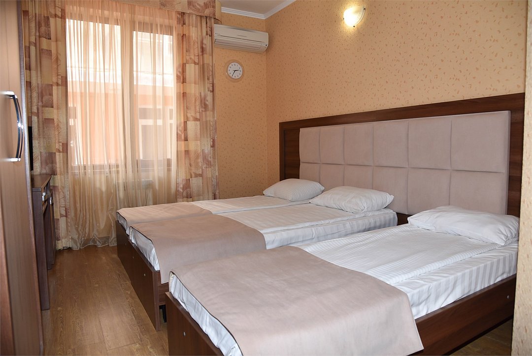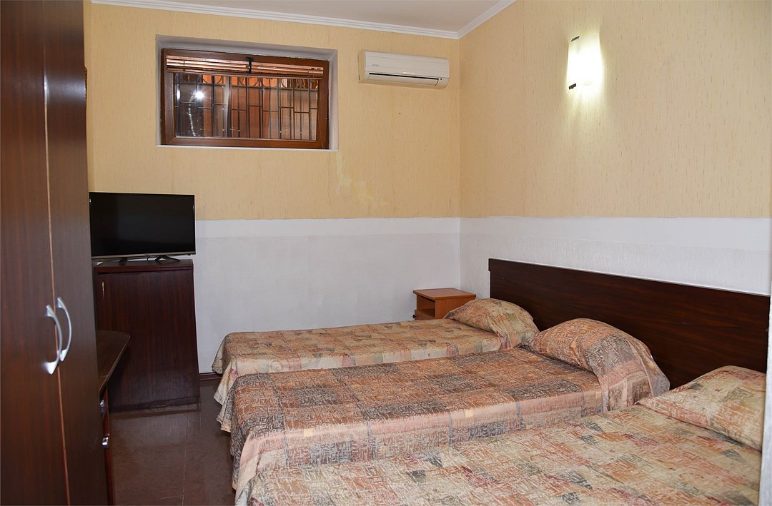 Трехместный номер с двуспальной кроватью и раскладным креслом. В номере телевизор,мини-холодильник, кондиционер,шкаф, тумбочки,журнальный столик. В номере санузел ( душ).Трехместный номер с 3 кроватями