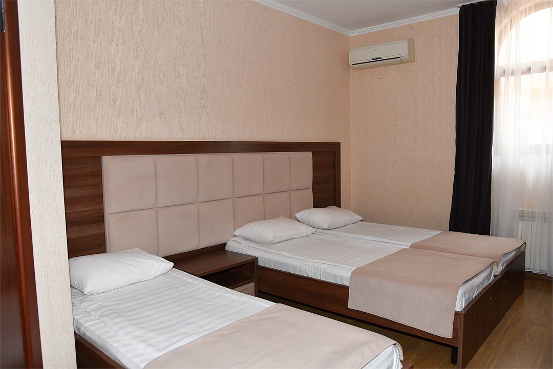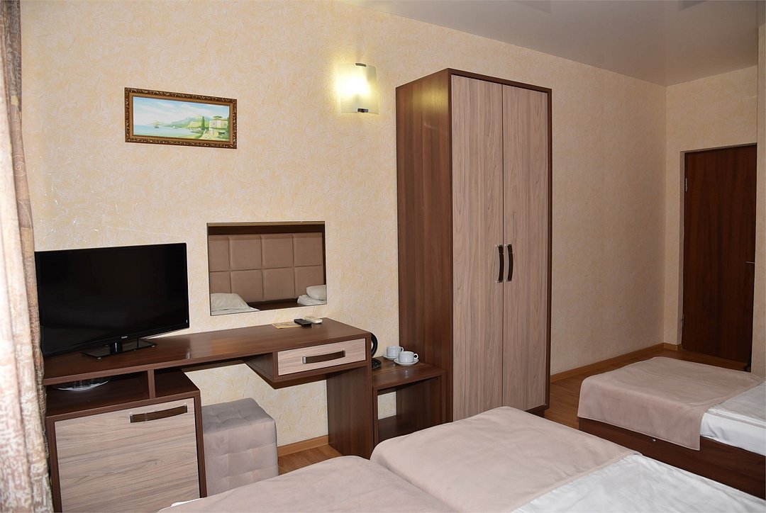 В номере три раздельные кровати, телевизор, кондиционер, мини-холодильник,шкаф, тумбочки, журнальный столик. Санузел в номере(душ).Стандартный 3 местный с раздельными кроватями