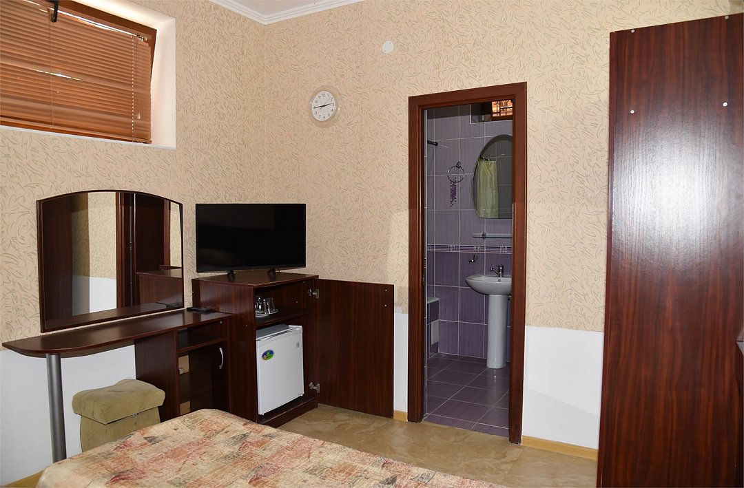 В номере двуспальная кровать, большой диван, телевизор, мини-холодильник, кондиционер,шкаф, тумбочки, журнальный столик, санузел в номере( душ).Пятиместный номер"Полу-цоколь"
