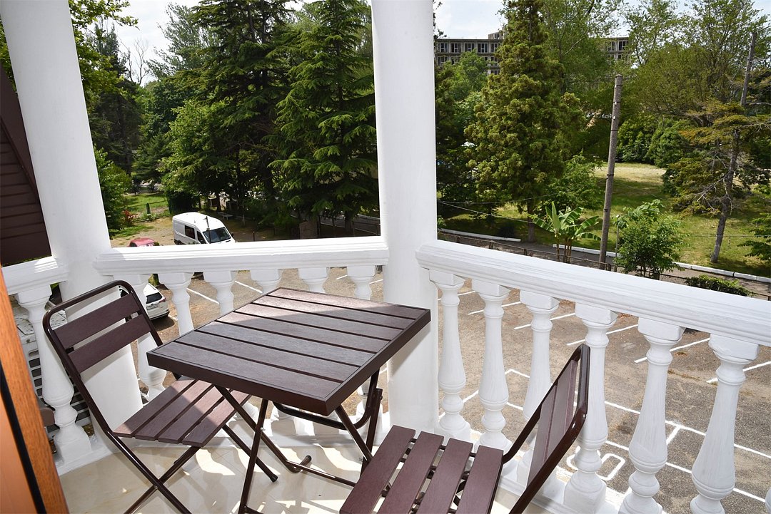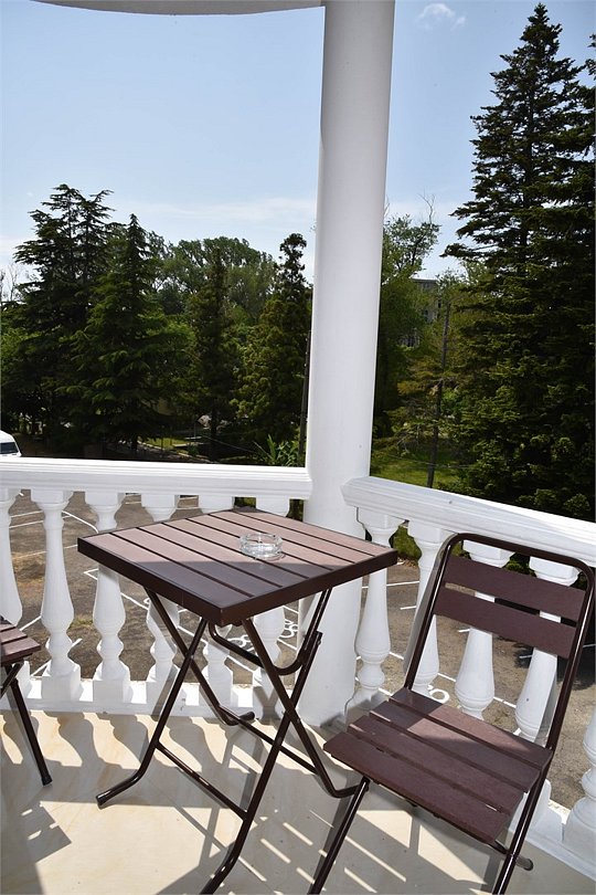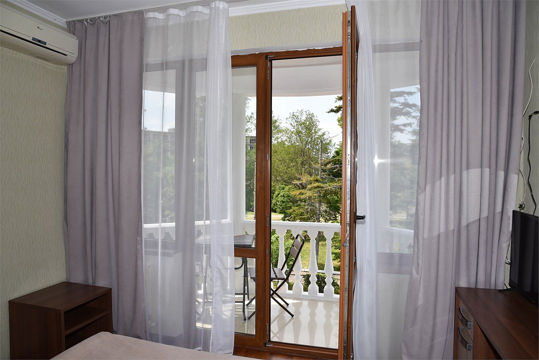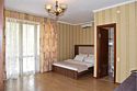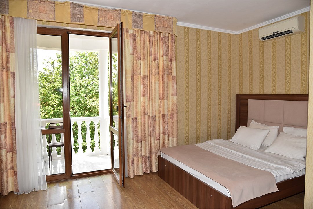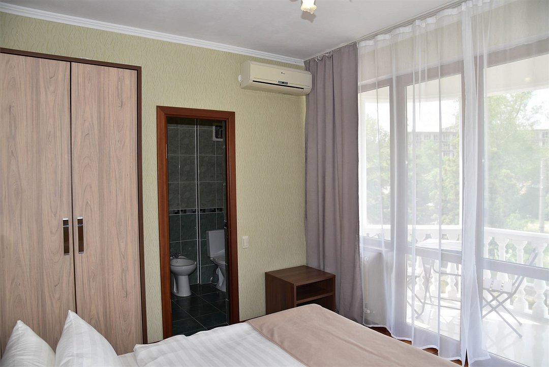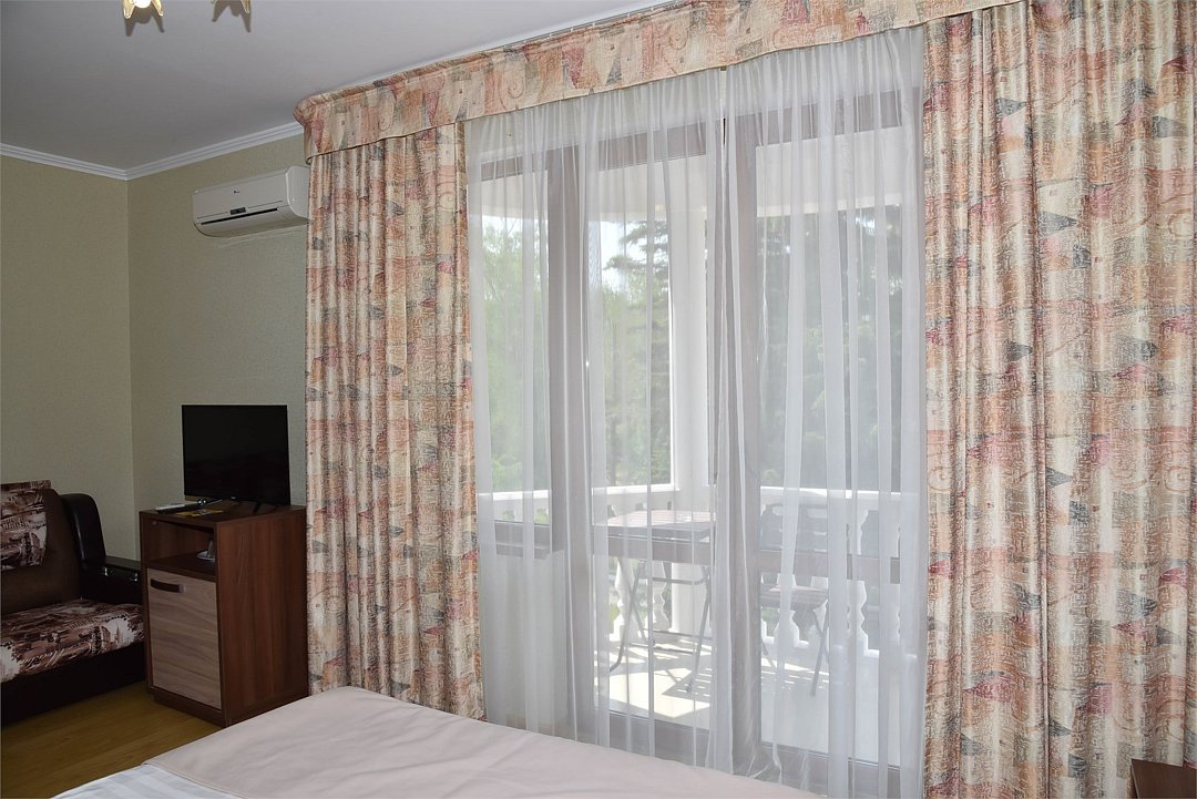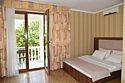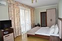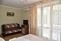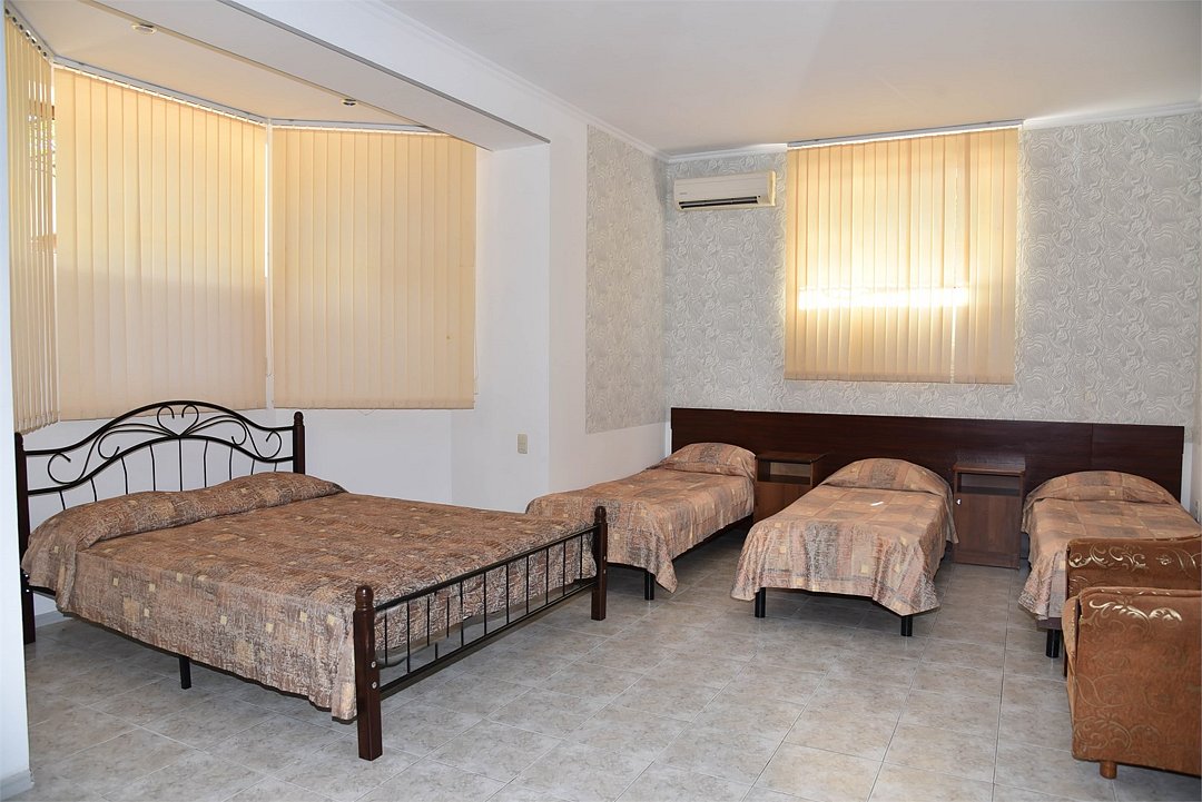 В номере двуспальная кровать,большой диван, телевизор, кондиционер, мини-холодильник, шкаф, тумбочки, столик с зеркалом, санузел в номере (душ).Четырехместный номер с балконом