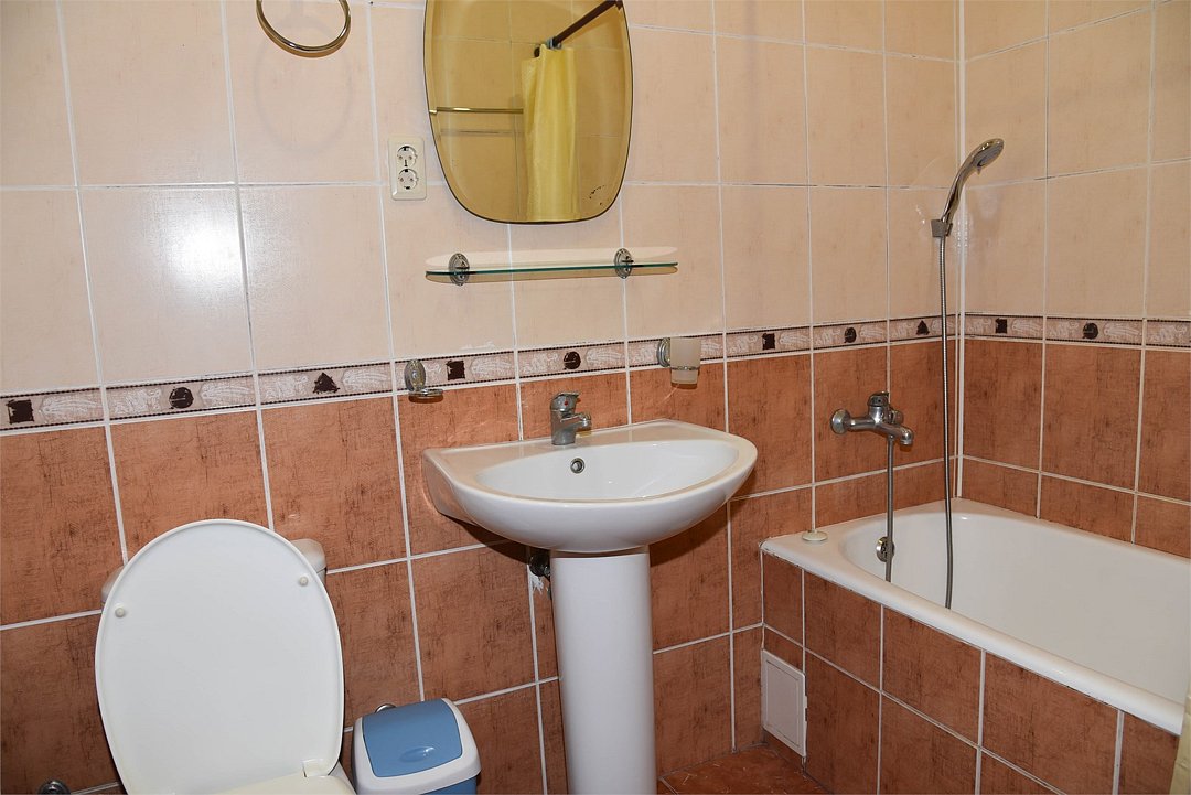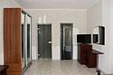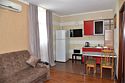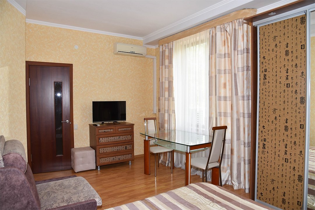 В номере две спальни, двуспальная кровать, две односпальные кровати,большой диван, телевизор, холодильник, кондиционер, ванна,шкафы, обеденный стол, стулья, балкончик,микроволновка, чайник,в санузле ванна.Студия-эконом