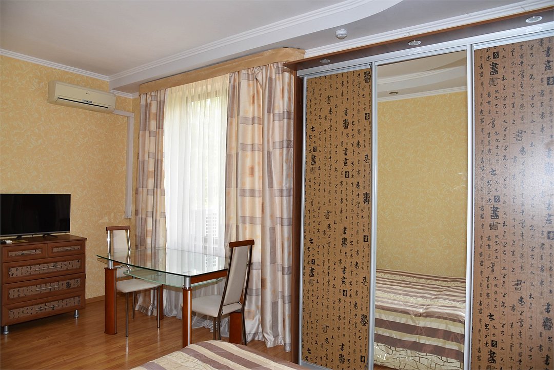 В номере двуспальная кровать, разборное кресло, диван, телевизор,холодильник, кондиционер, шкаф, журнальный столик,микроволновка, чайник, санузел в номере( душ)Трехкомнатные апартаменты с кухней