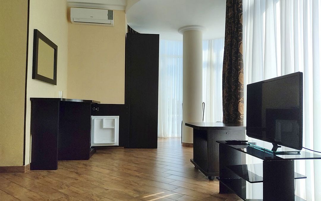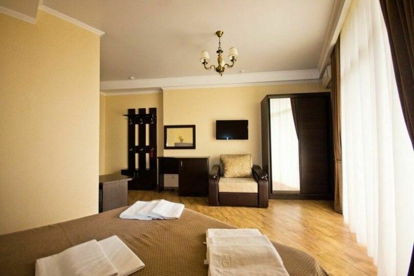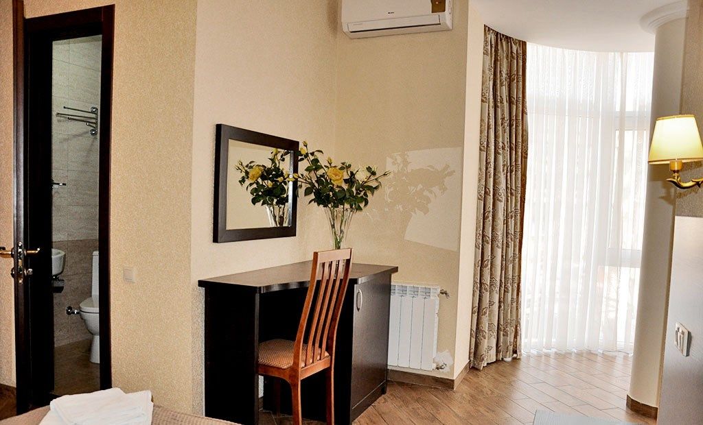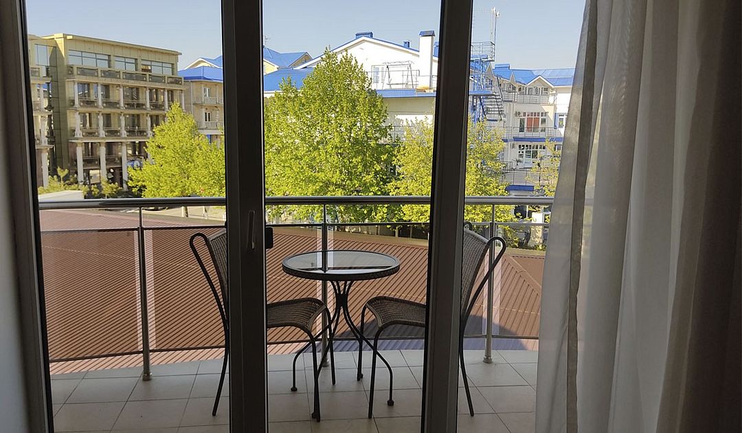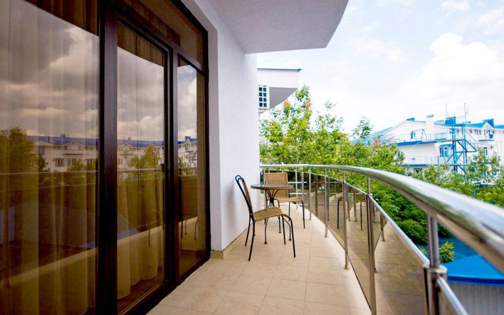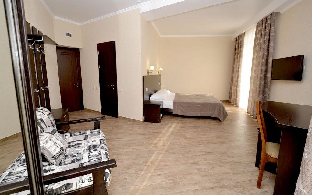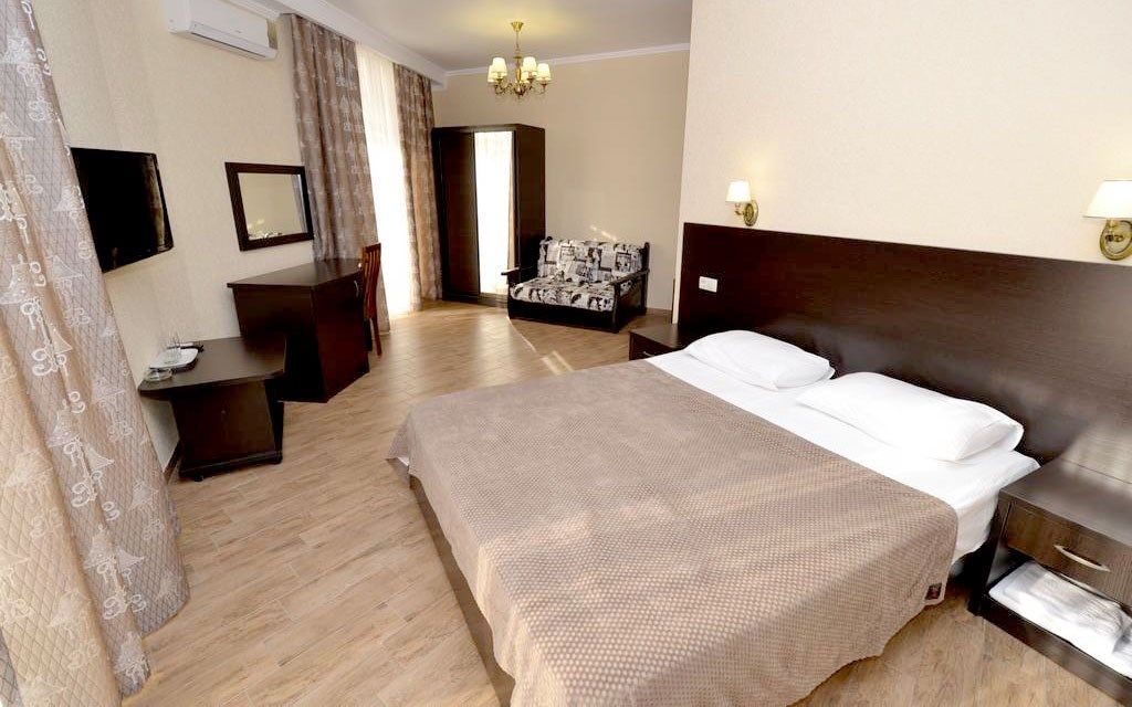 Уютный комфортабельный номер, общей площадью 28 м², Предназначен для размещения до 4-х гостей. Оборудован большой двуспальной кроватью, диваном-кроватью, кондиционером, телевизором, холодильником, шкафом с зеркалом для одежды, вешалкой, журнальным и туалетным столиком с зеркалом. В ванной комнате: душевая кабина, туалет, фен, гигиенические принадлежности. На балконе круглый столик со стульями. Бесплатное Wi-Fi подключение во всем отеле.Услуги и удобства