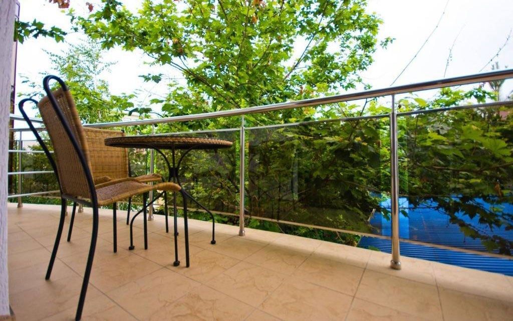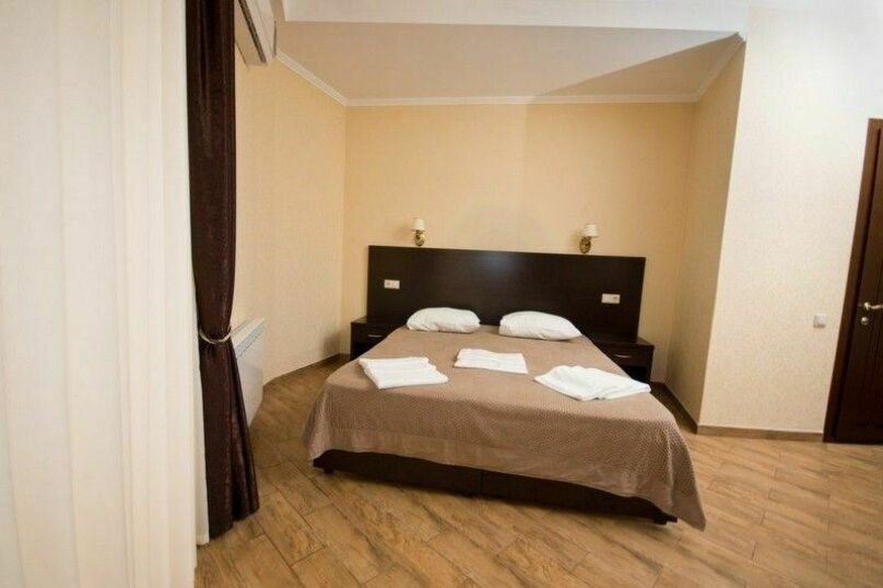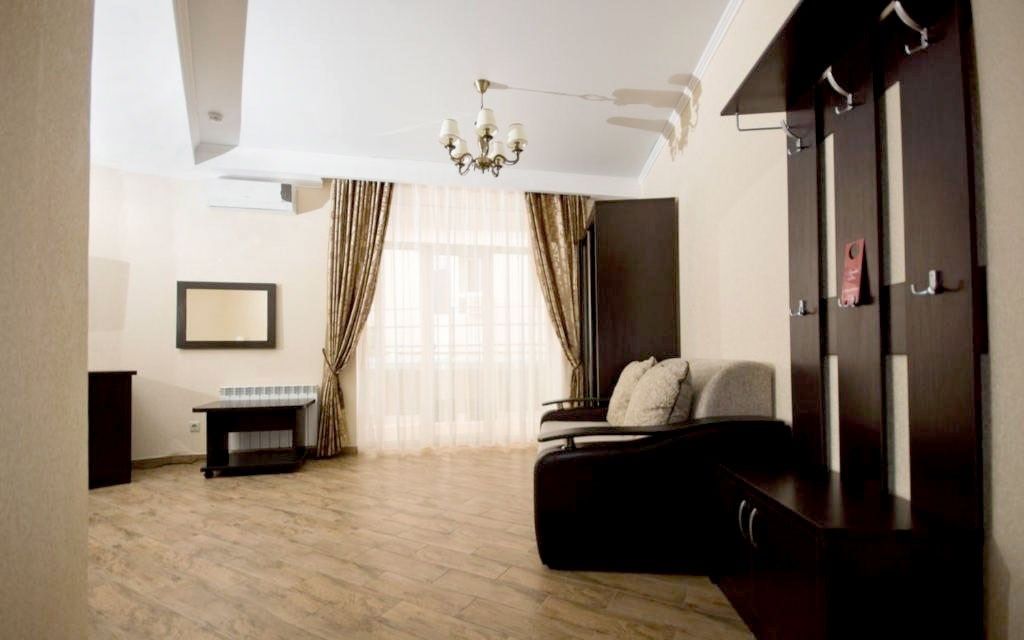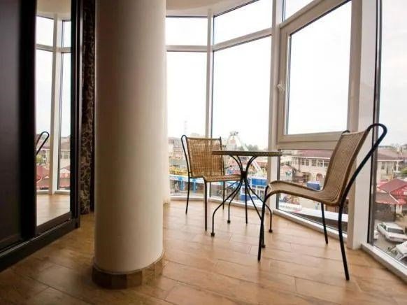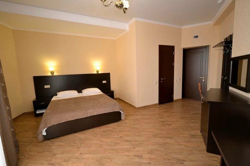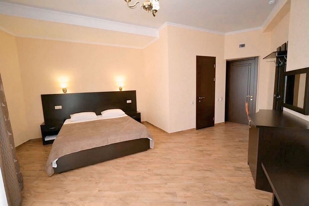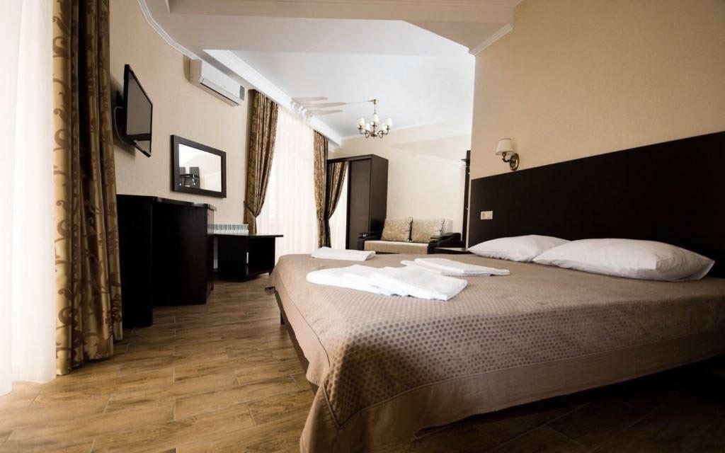 Уютный комфортабельный номер, общей площадью 28 м², Предназначен для размещения до 4-х гостей. Оборудован большой двуспальной кроватью, диваном-кроватью, кондиционером, телевизором, холодильником, шкафом с зеркалом для одежды, вешалкой, журнальным и туалетным столиком с зеркалом. В ванной комнате: душевая кабина, туалет, фен, гигиенические принадлежности. На балконе круглый столик со стульями. Бесплатное Wi-Fi подключение во всем отеле.Услуги и удобства