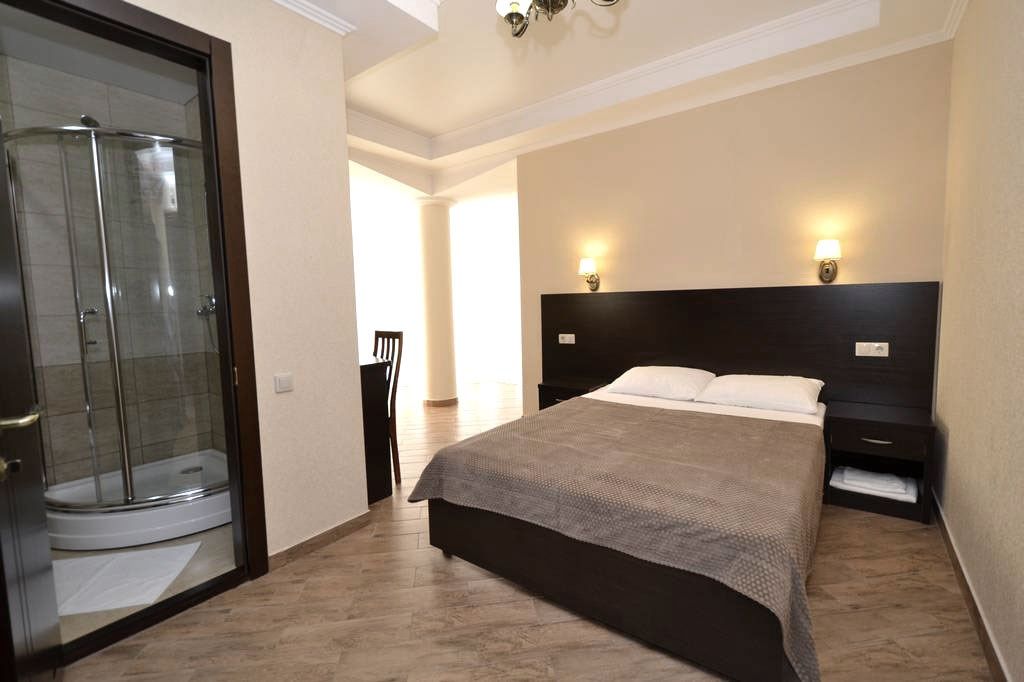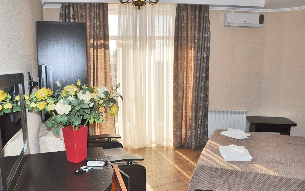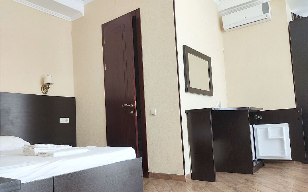 Уютный современный номер с удобствами, общей площадью 25 м², Предназначен для размещения до 2-х человек. Оборудован большой двуспальной кроватью, кондиционером, телевизором, холодильником, шкафом с зеркалом для одежды, вешалкой, журнальным и туалетным столиком с зеркалом. В ванной комнате: душевая кабина, туалет, фен, гигиенические принадлежности. Бесплатное Wi-Fi подключение во всем отеле.Услуги и удобства