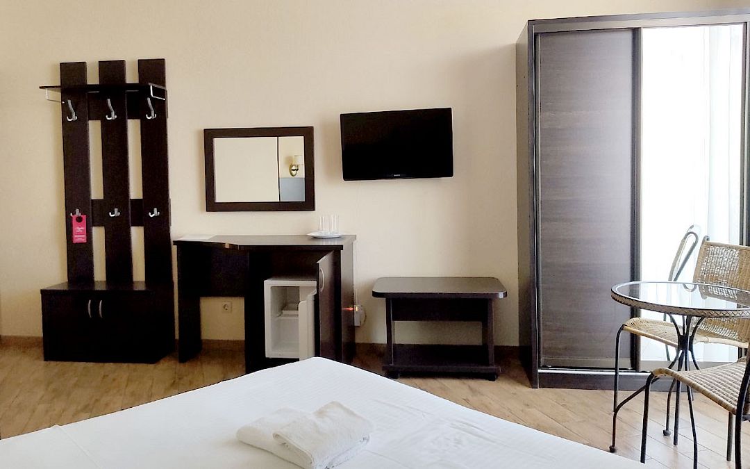 Уютный современный номер с удобствами, общей площадью 25 м², Предназначен для размещения до 2-х человек. Оборудован большой двуспальной кроватью, кондиционером, телевизором, холодильником, шкафом с зеркалом для одежды, вешалкой, журнальным и туалетным столиком с зеркалом. В ванной комнате: душевая кабина, туалет, мойдодыр, фен, гигиенические принадлежности. На балконе круглый столик со стульями. Бесплатное Wi-Fi подключение во всем отеле.Услуги и удобства