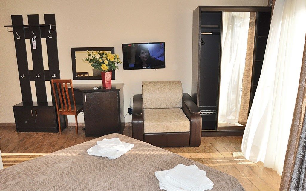 Современный комфортабельный номер, общей площадью 28 м², Предназначен для размещения до 3-х гостей. Оборудован большой двуспальной кроватью, креслом-кроватью, кондиционером, телевизором, холодильником, шкафом с зеркалом для одежды, вешалкой, журнальным и туалетным столиком с зеркалом. В ванной комнате: душевая кабина, туалет, фен, гигиенические принадлежности. На балконе круглый столик со стульями. Бесплатное Wi-Fi подключение во всем отеле.Услуги и удобства