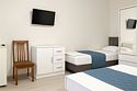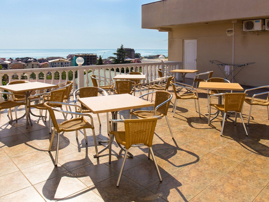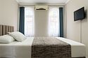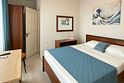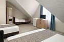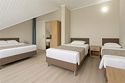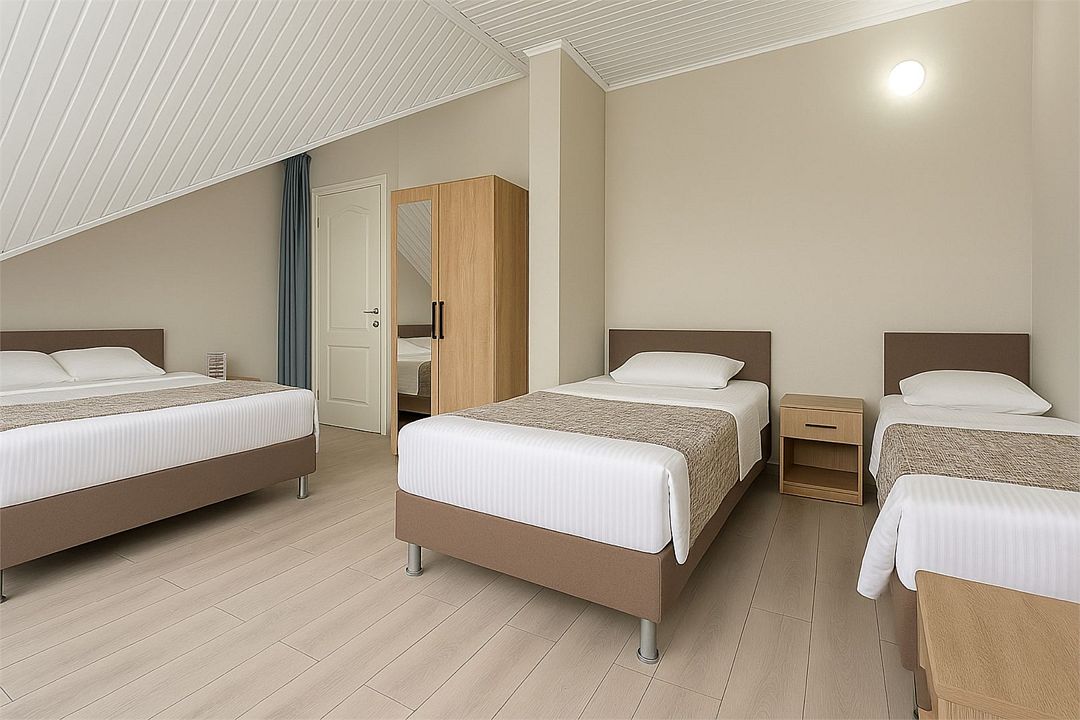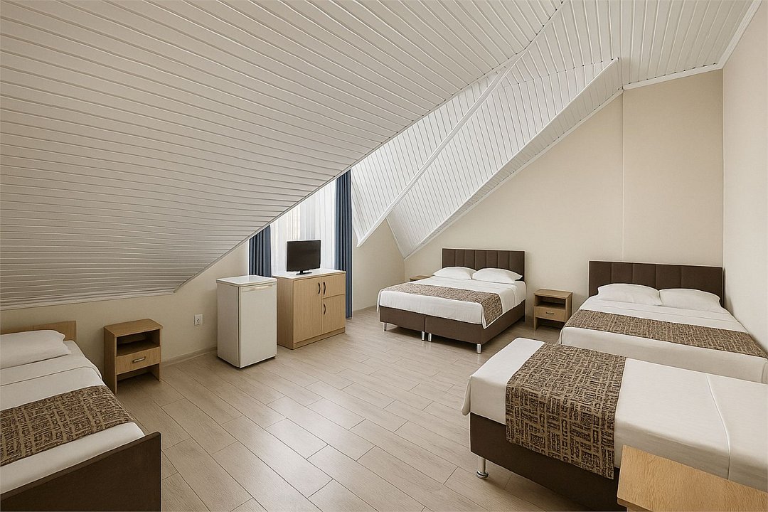 Номер рассчитан на 4 основных места. В комнате предусмотрено наличие односпальных кроватей и 1 двуспальной кровати. Номер оборудован кондиционером, холодильником,телевизором. Гладильная доска, душ, туалет общие на этаже. Номера находятся на мансардном этаже без балконов с выходом на террасу с видом на море.Услуги и удобства