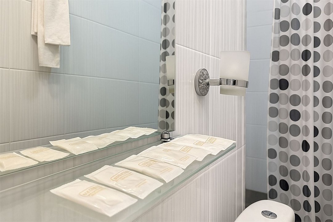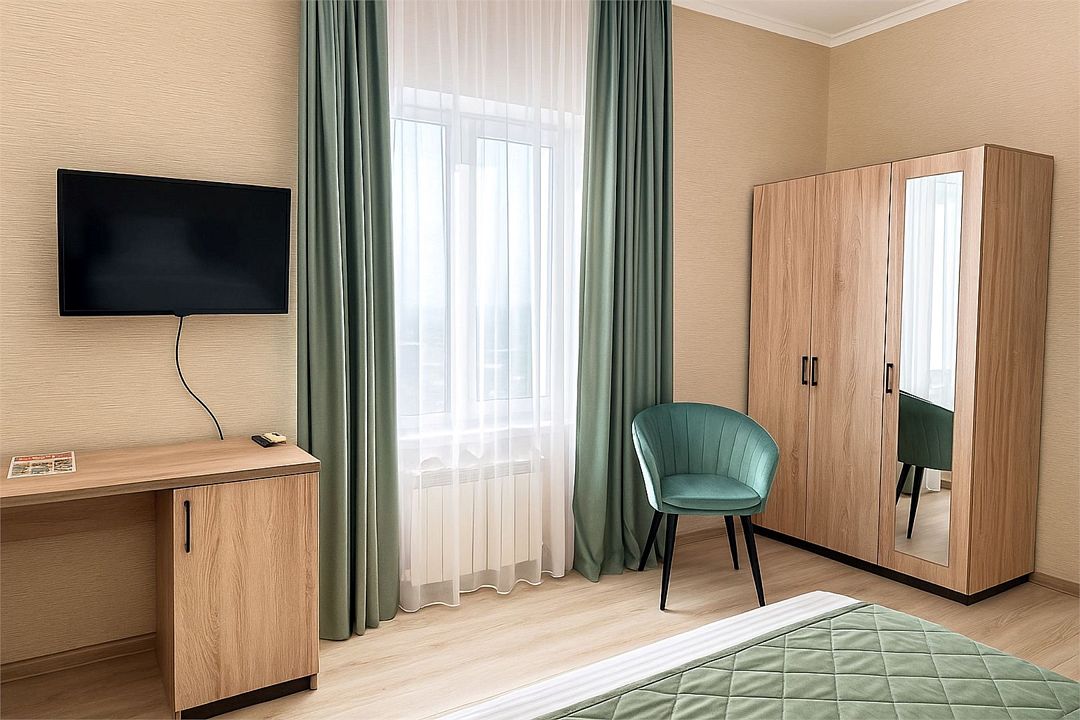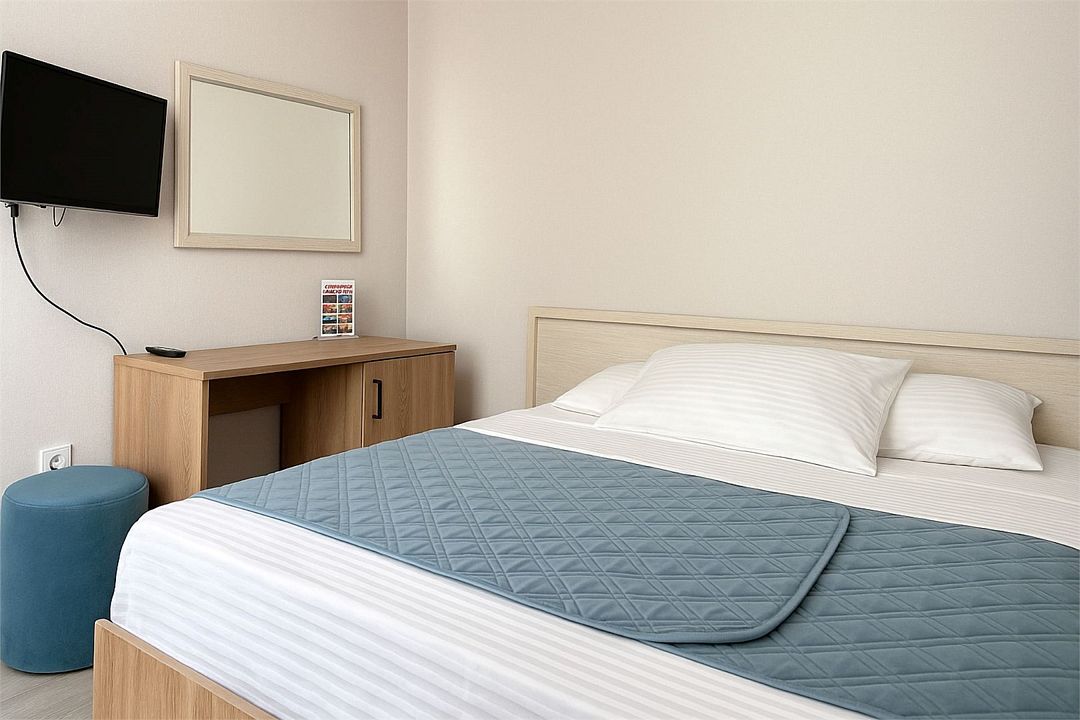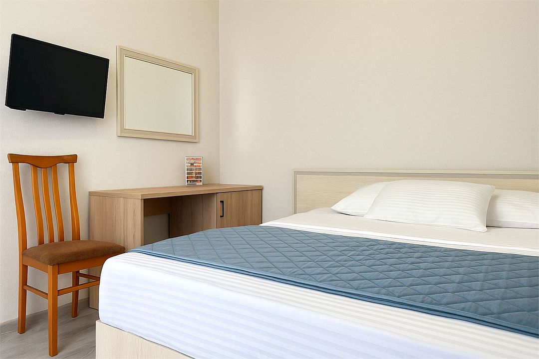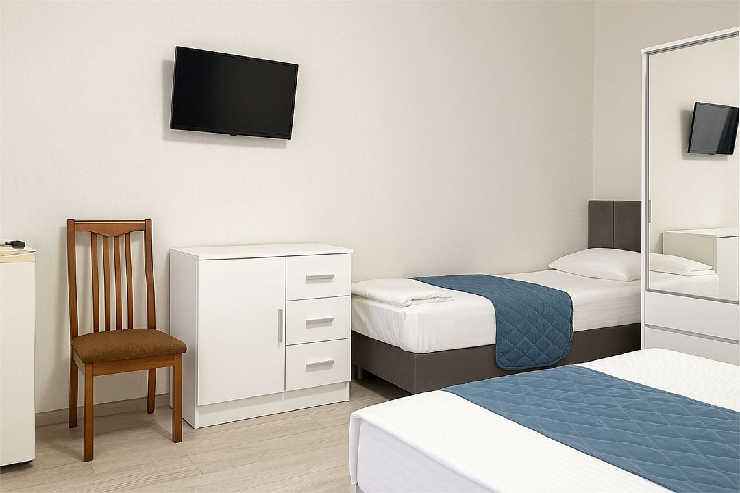 Однокомнатный номер площадью 18-20 кв.м., рассчитанный на два основных места и 1 дополнительное. В комнате предусмотрено наличие либо одной двуспальной, либо двух односпальных кроватей. Номер оборудован всем необходимым для комфортного проживания: холодильник, телевизор, кондиционер, душ совмещенный с туалетом в номере.Услуги и удобства