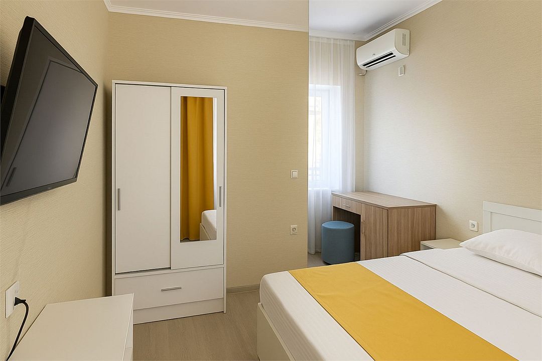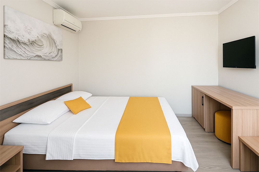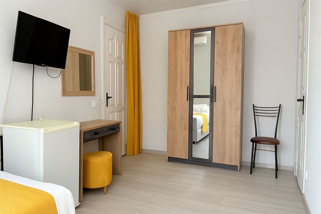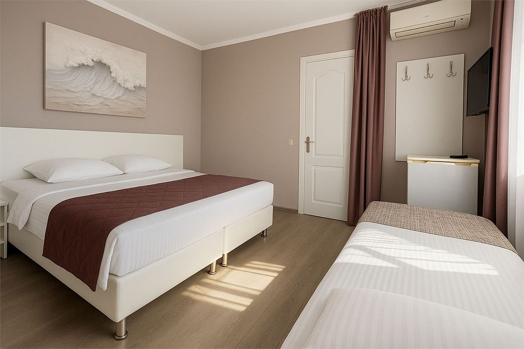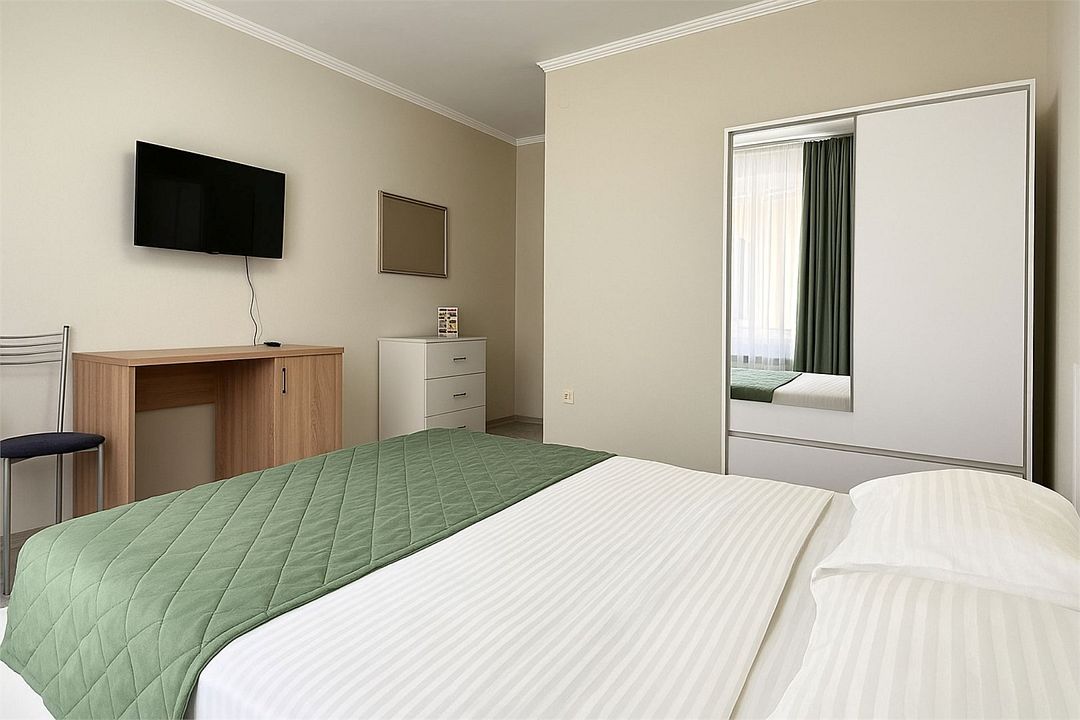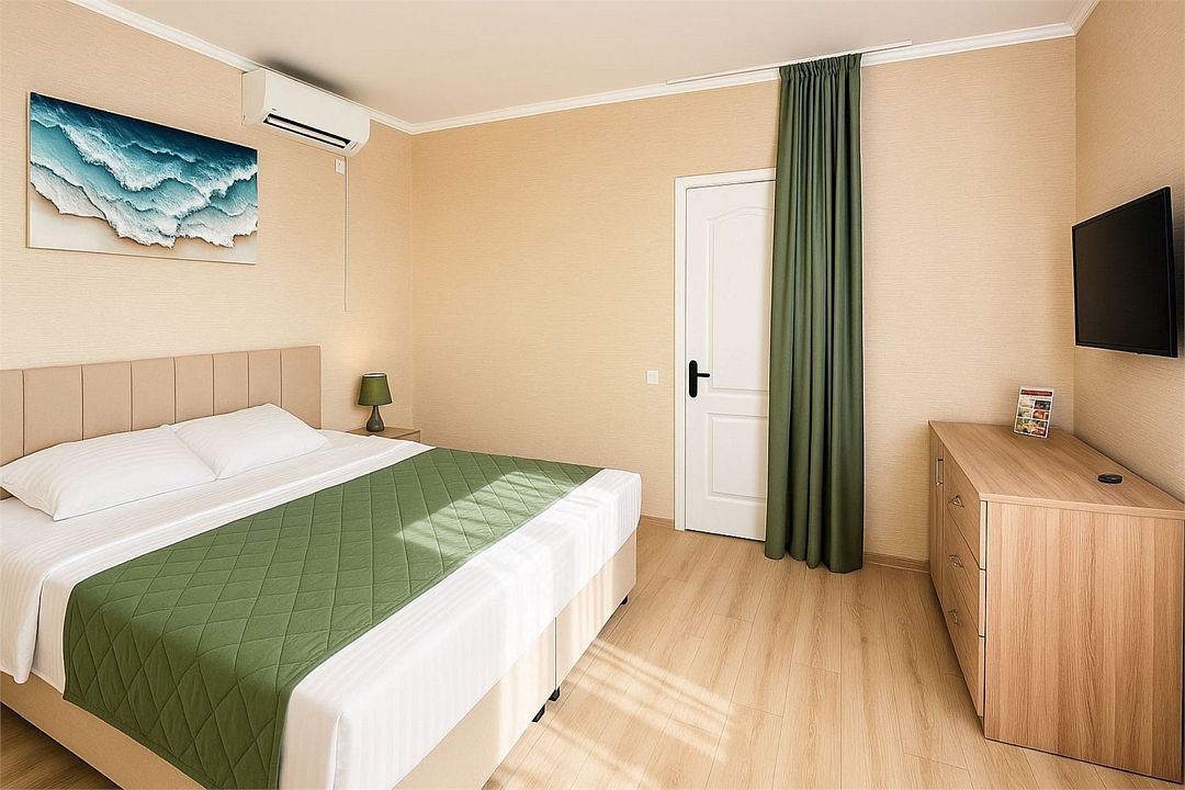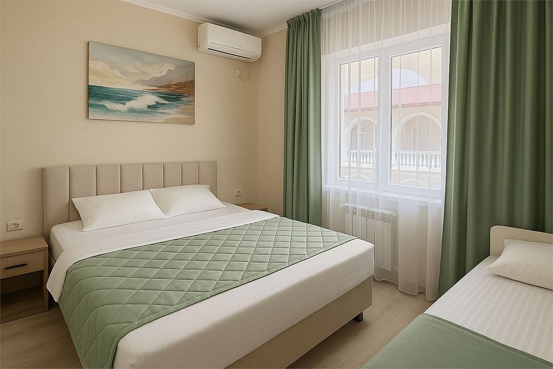 Семейный Стандартный номер - это просторный однокомнатный номер 24-26 кв.м. Вместимость: до 4 человек. Проживание детей до 5 лет бесплатно без предоставления места. Номер оборудован всем необходимым для комфортного проживания: холодильник,телевизор, кондиционер, фен, душ и туалет в номере. Для удобства гостей предоставляем пляжные полотенца, тапочки и гигиенические принадлежности.Услуги и удобства