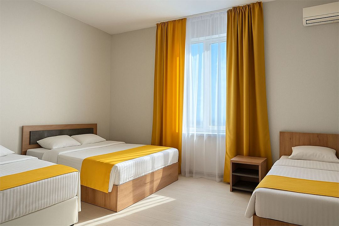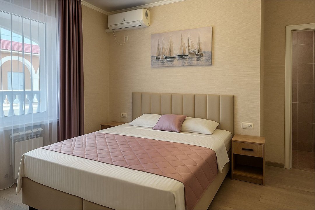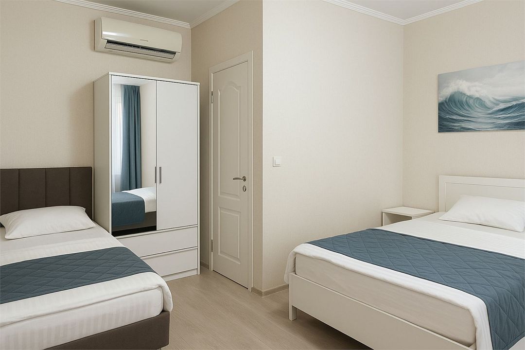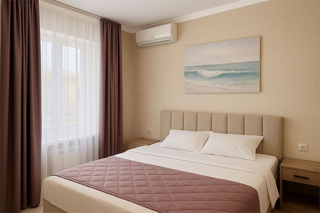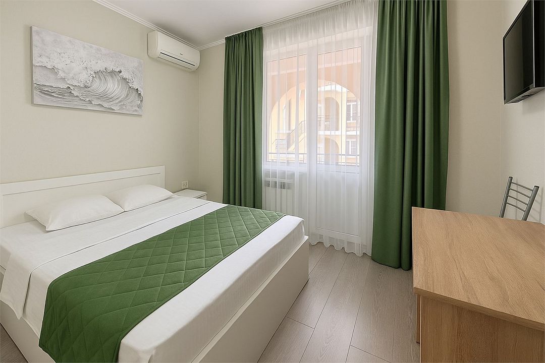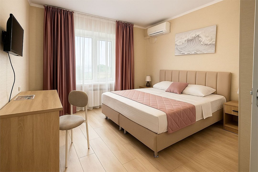 Семейный Стандартный номер - это просторный однокомнатный номер 24-26 кв.м. Вместимость: до 4 человек. Проживание детей до 5 лет бесплатно без предоставления места. Номер оборудован всем необходимым для комфортного проживания: холодильник,телевизор, кондиционер, фен, душ и туалет в номере. Для удобства гостей предоставляем пляжные полотенца, тапочки и гигиенические принадлежности.Услуги и удобства