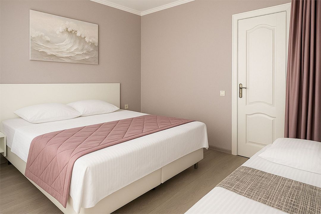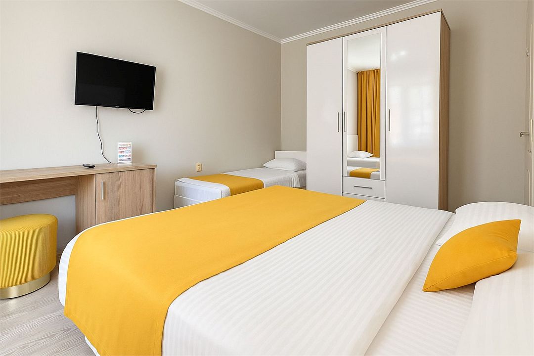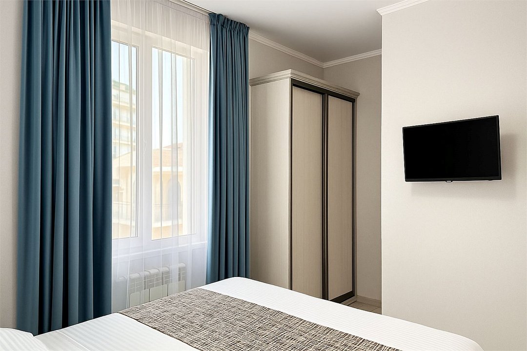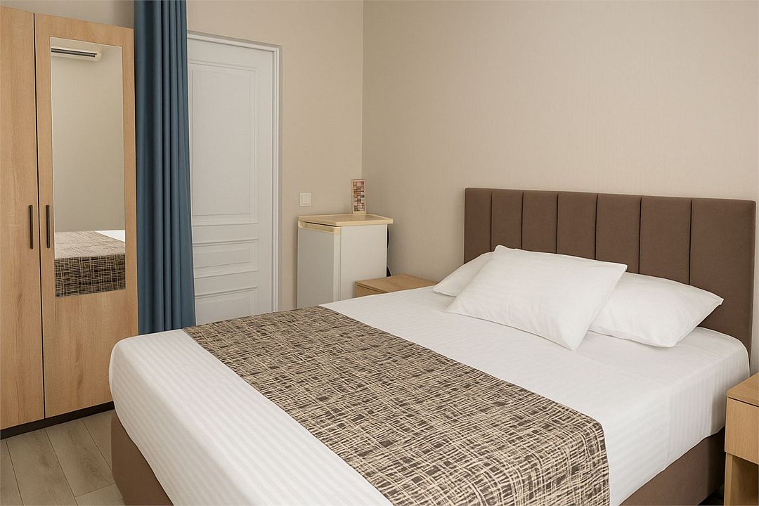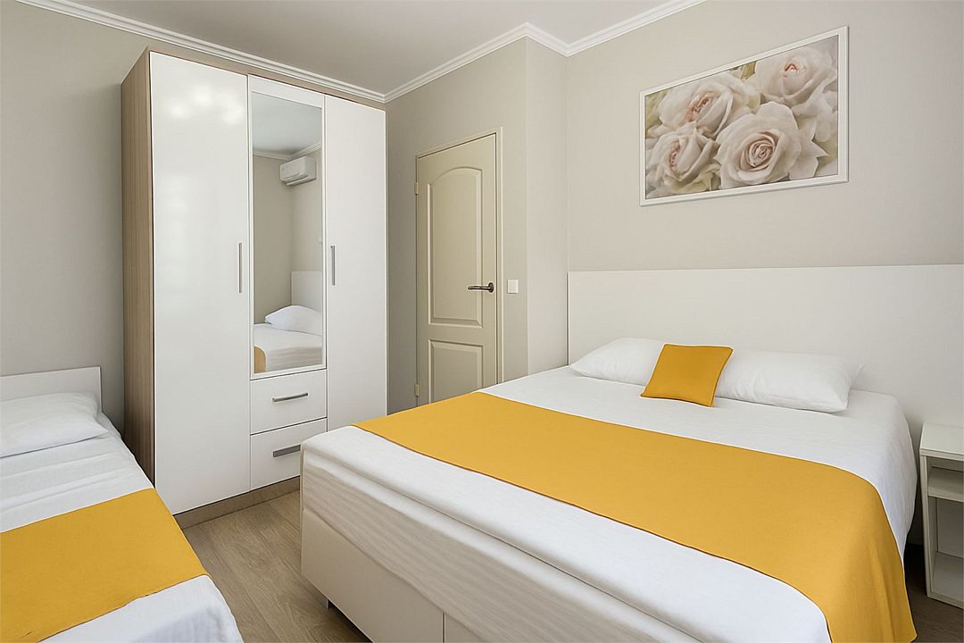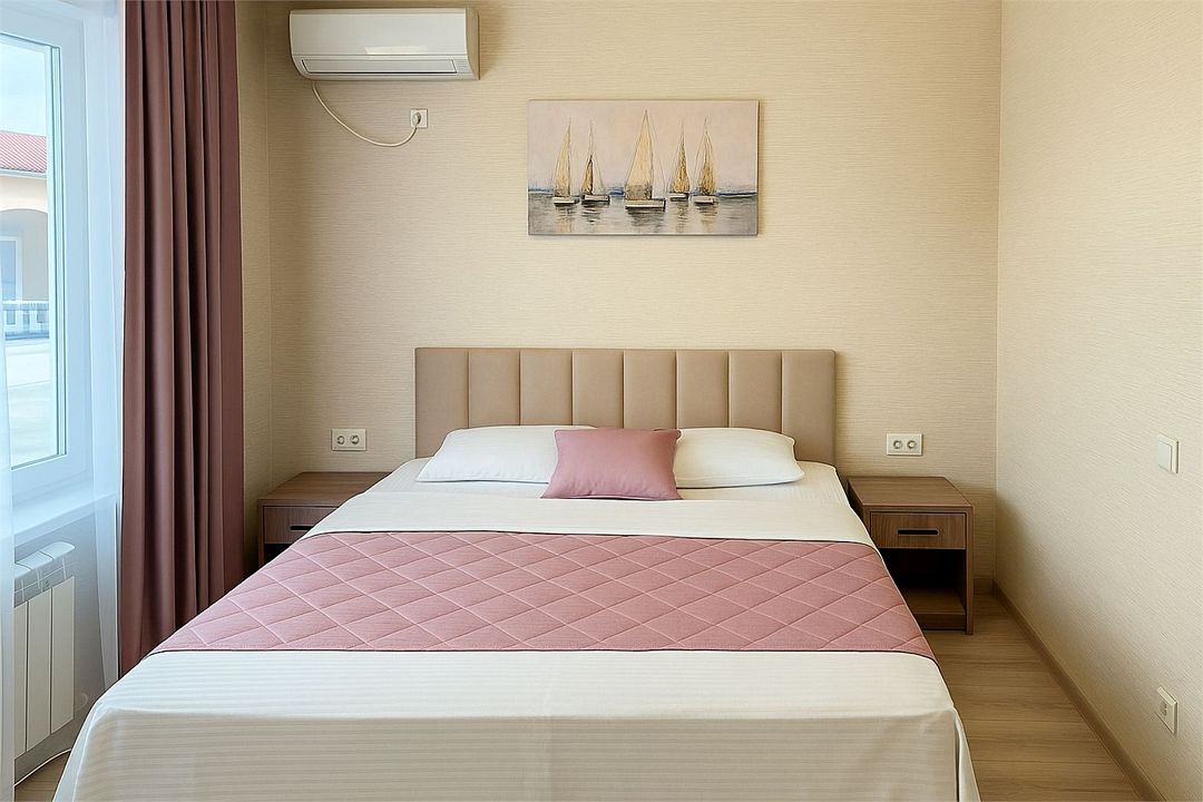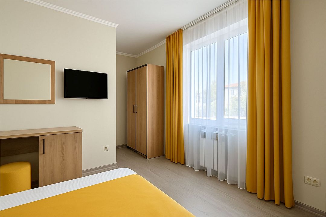 Семейный Стандартный номер - это просторный однокомнатный номер 24-26 кв.м. Вместимость: до 4 человек. Проживание детей до 5 лет бесплатно без предоставления места. Номер оборудован всем необходимым для комфортного проживания: холодильник,телевизор, кондиционер, фен, душ и туалет в номере. Для удобства гостей предоставляем пляжные полотенца, тапочки и гигиенические принадлежности.Услуги и удобства