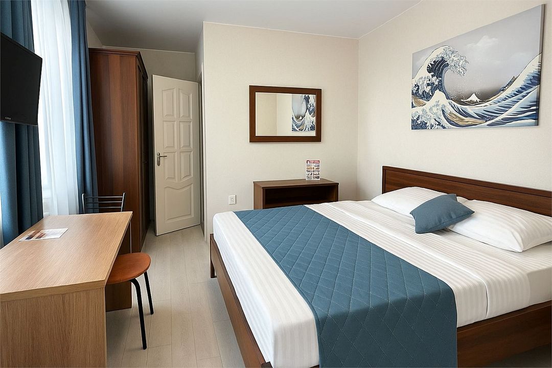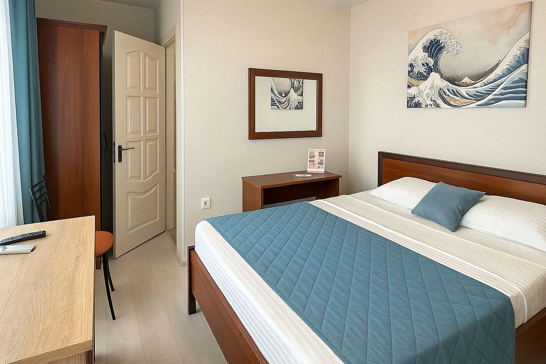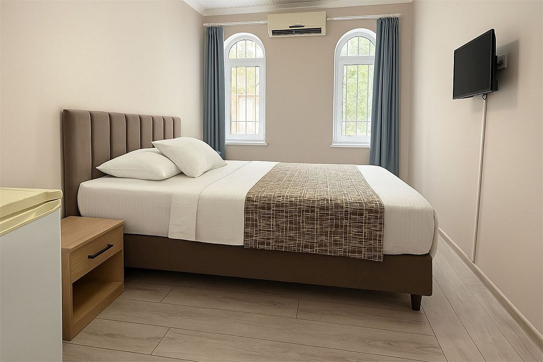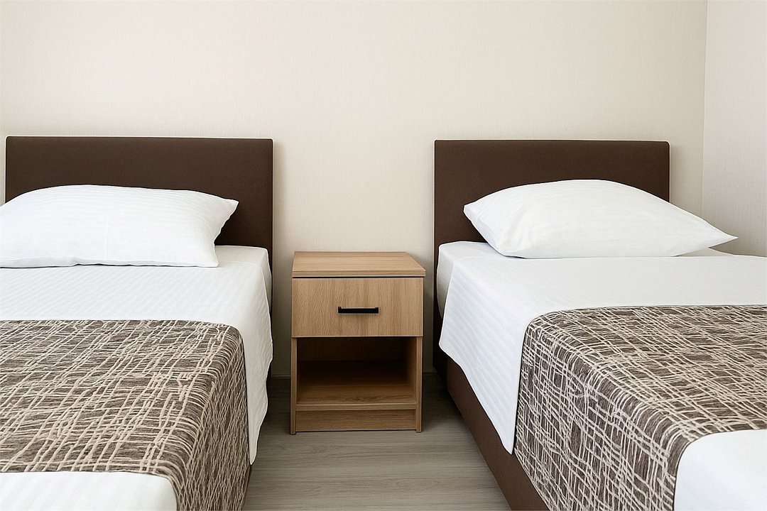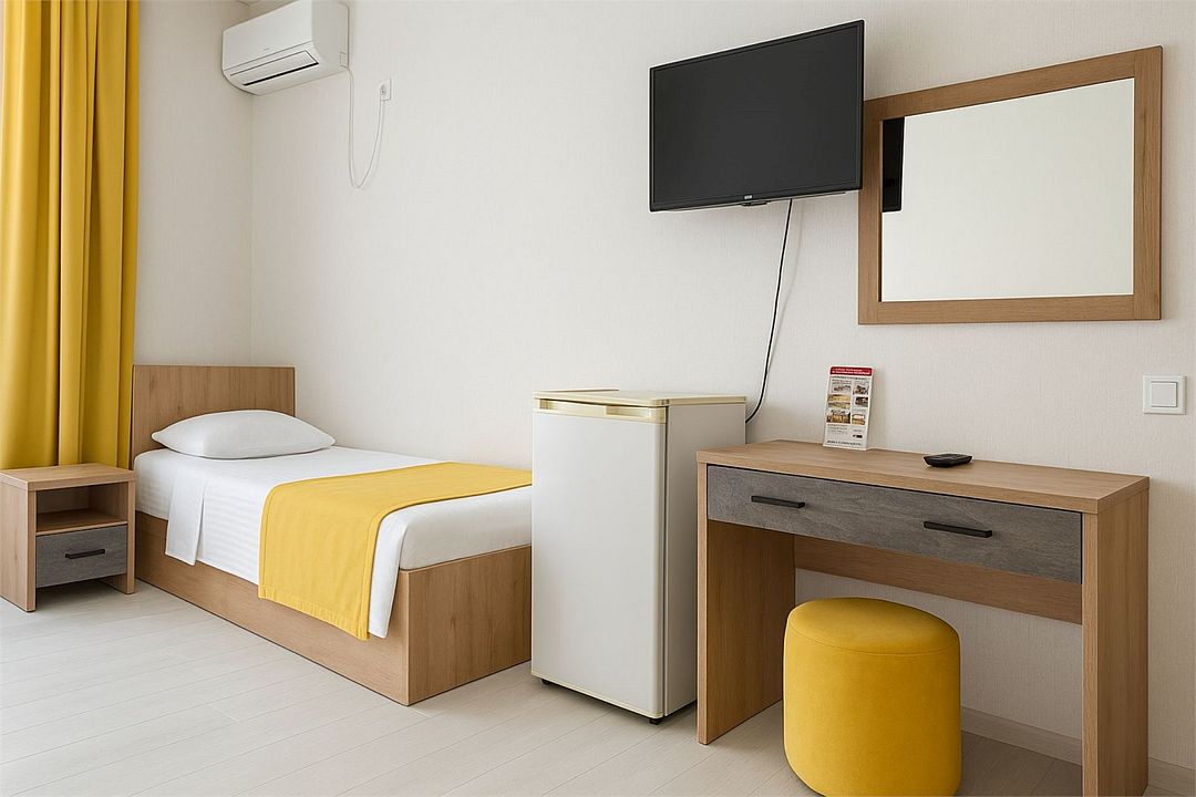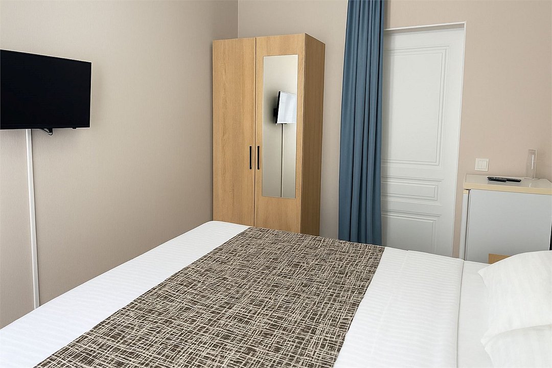 Однокомнатный номер площадью 16-18 кв.м., рассчитан на два основных места. В комнате предусмотрено наличие либо одной двуспальной, либо двух односпальных кроватей. Номер оборудован всем необходимым для комфортного проживания: холодильник, телевизор, кондиционер, душ совмещенный с туалетом в номере.Услуги и удобства