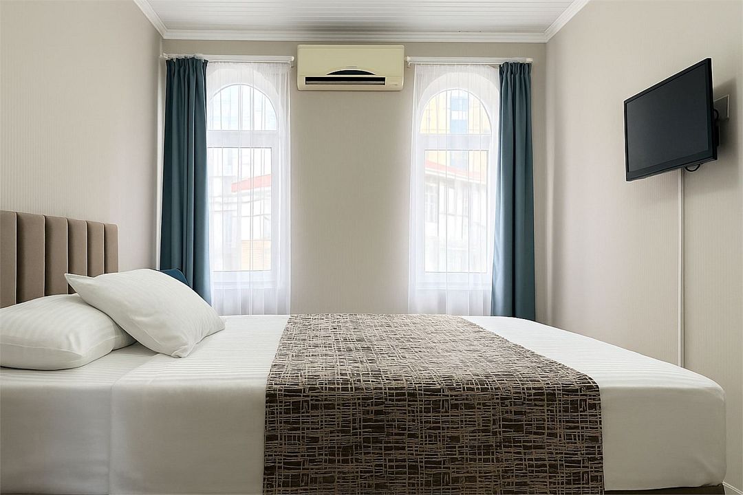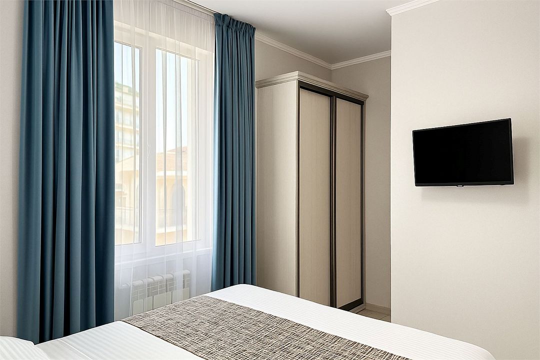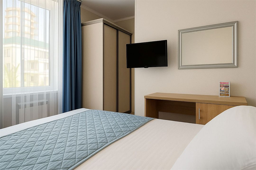 кабельное телевидение, Wi-Fi, холодильник, ванная комната, санузел, банные полотенца, две односпальные или большая двуспальная кровать, шкаф для одежды, вешалки, зеркало, унитаз, раковина, душ, сплит-система, телевизор с плоским экраномВ гостиничном номере