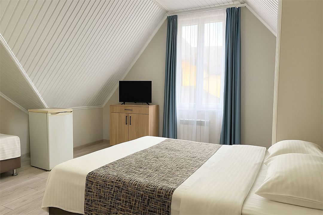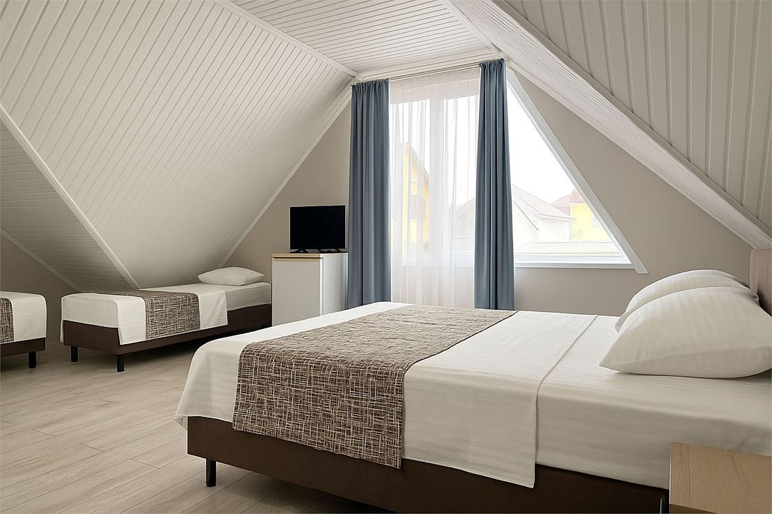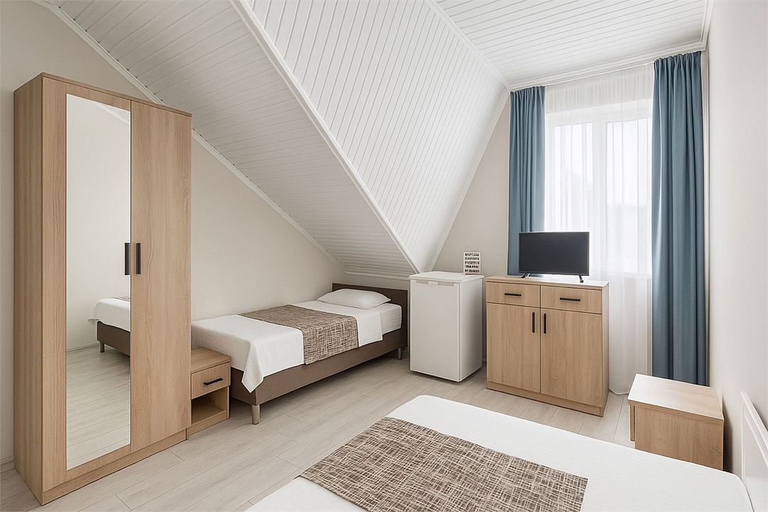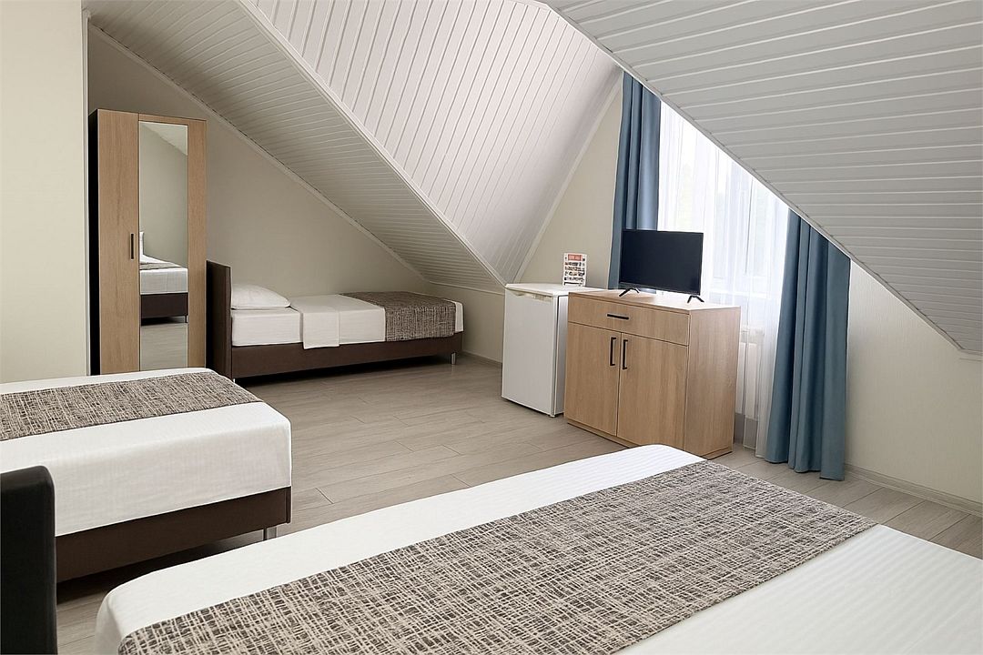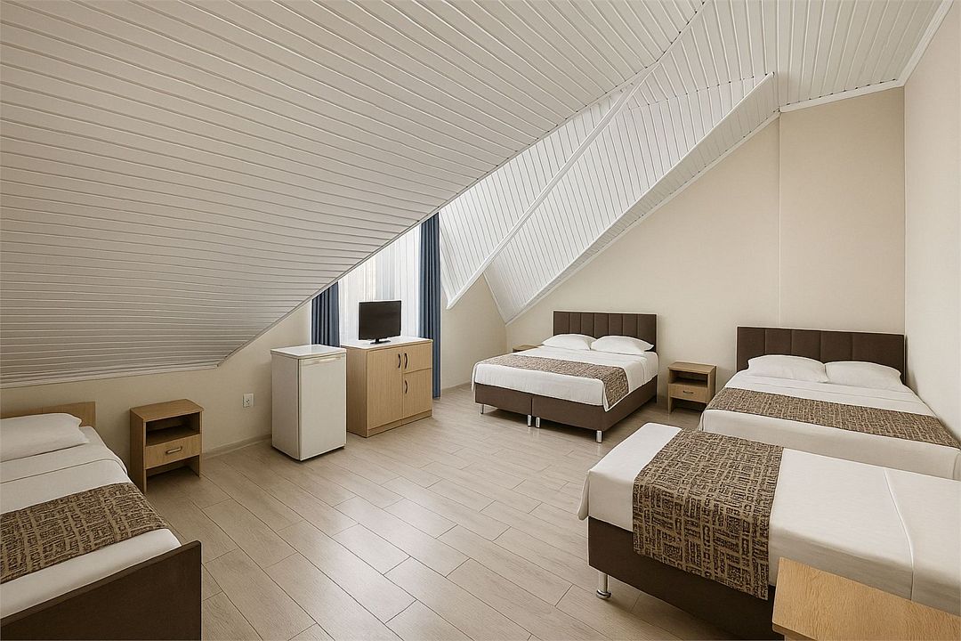 Номер Стандарт Эконом рассчитан на 3 основных места. В комнате 16-20 кв.м, предусмотрено наличие односпальных кроватей или 1 двухспальной. Номер оборудован кондиционером,холодильником,телевизором. Душ, туалет общие на этаже. Номера находятся на мансардном этаже.Услуги и удобства