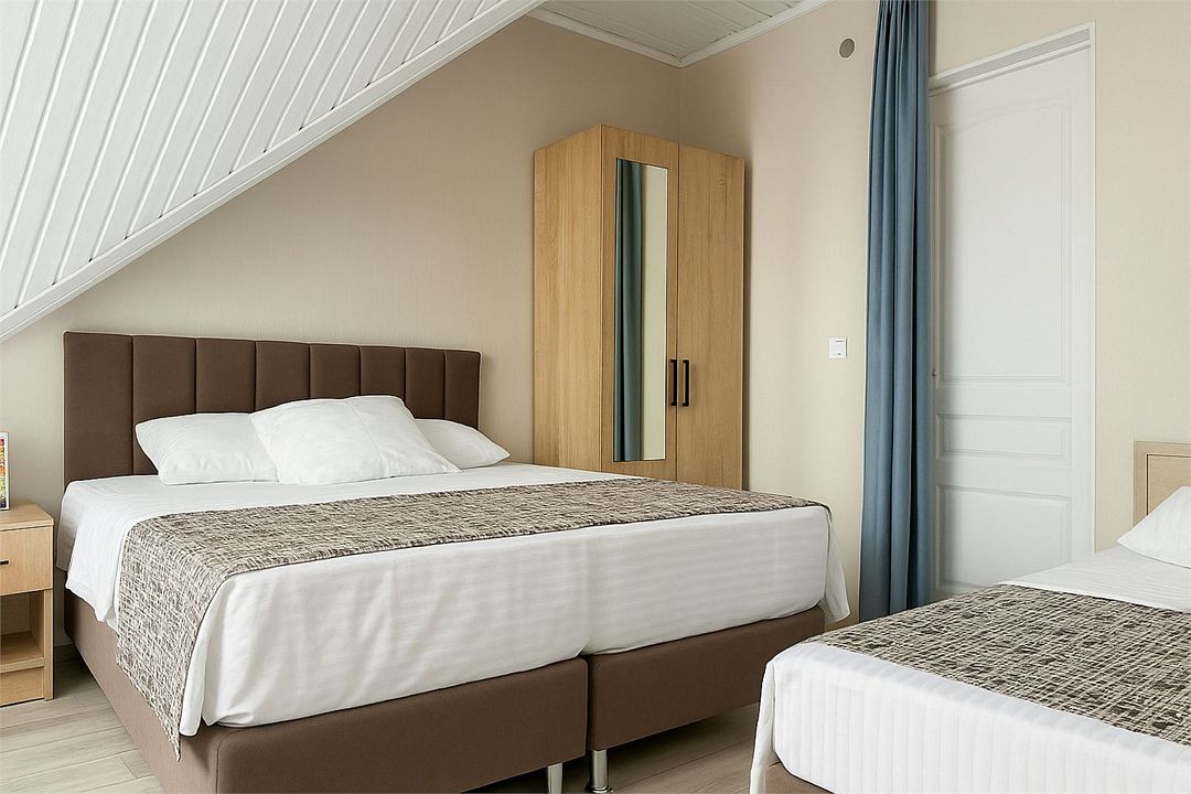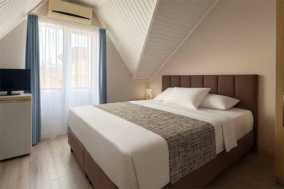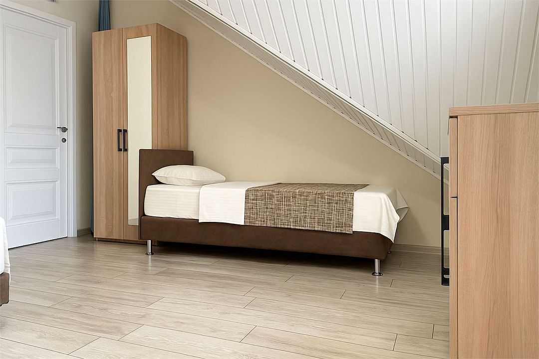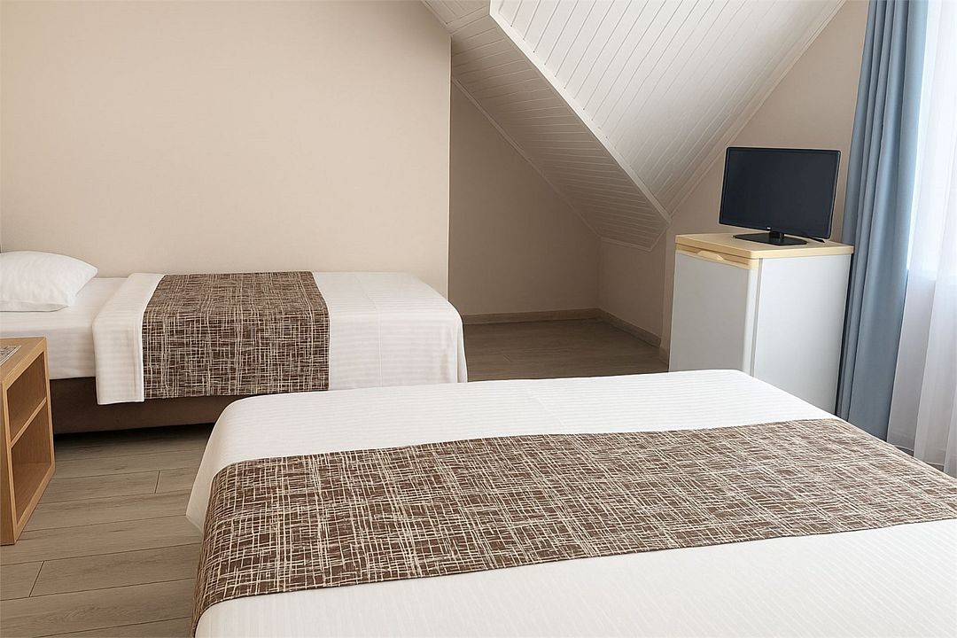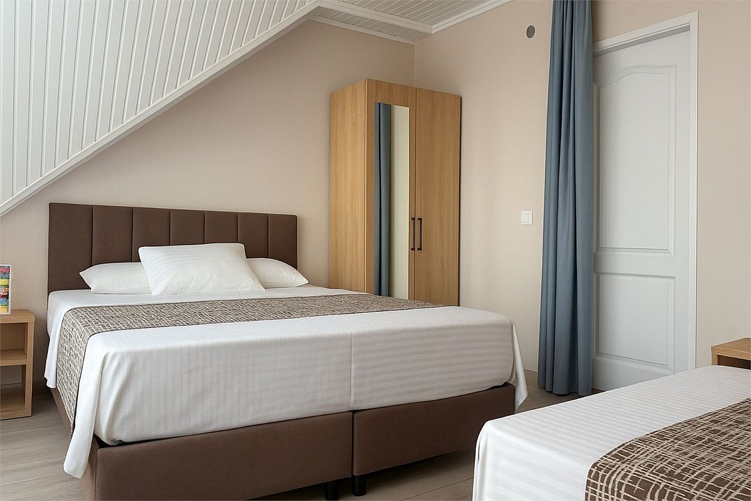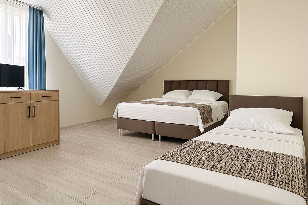 Номер Стандарт Эконом рассчитан на 3 основных места. В комнате 16-20 кв.м, предусмотрено наличие односпальных кроватей или 1 двухспальной. Номер оборудован кондиционером,холодильником,телевизором. Душ, туалет общие на этаже. Номера находятся на мансардном этаже.Услуги и удобства