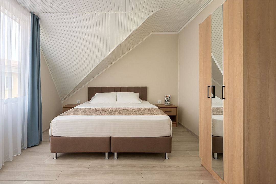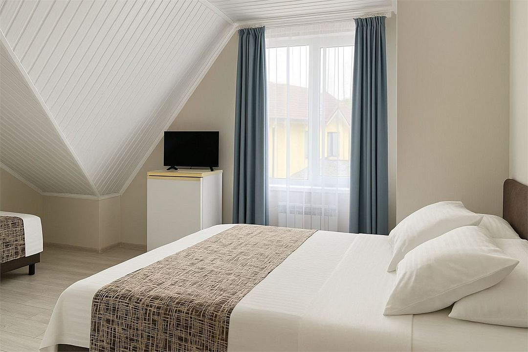кабельное телевидение, Wi-Fi, холодильник, банные полотенца, односпальная кровать, две односпальные или большая двуспальная кровать, стулья, шкаф для одежды, зеркало, общая ванная комната, санузел на этаже, сплит-система, душ на этаже, мансардные окна, услуги прачечной (платно)В гостиничном номере