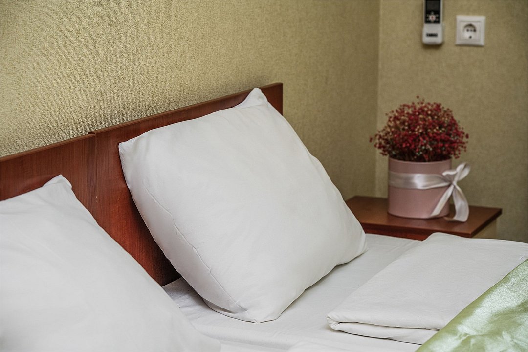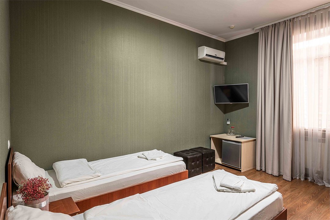 Wi-Fi, светильник, фен, утюг, санузел, банные полотенца, две односпальные или большая двуспальная кровать, гладильная доска, тумбы, шкаф для одежды, вешалки, зеркало, пуфики, унитаз, раковина, отопление, душ, вид на город, вид во двор, ламинат, стаканы, стол, туалет, сплит-система, телевизор с плоским экраном, мини-холодильник, москитная сетка, уборка номера, услуги прачечной (платно), вешалки-плечики, мылоВ номере