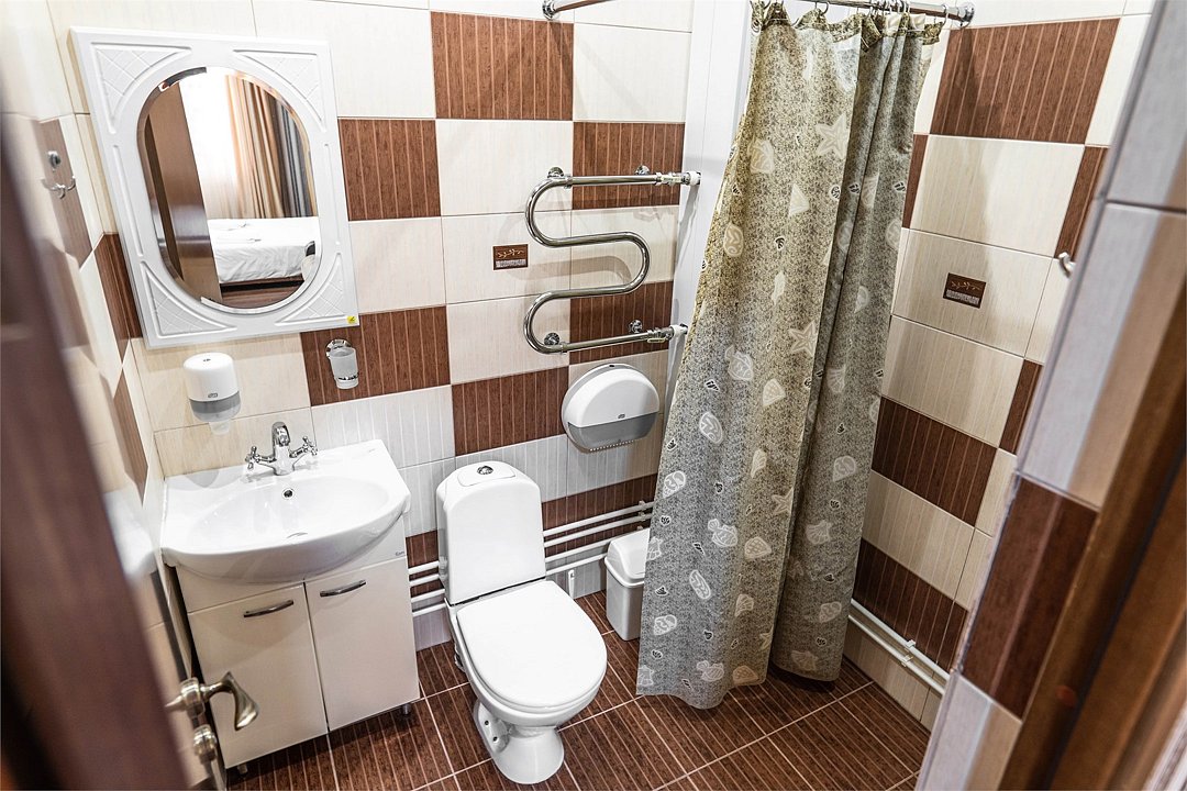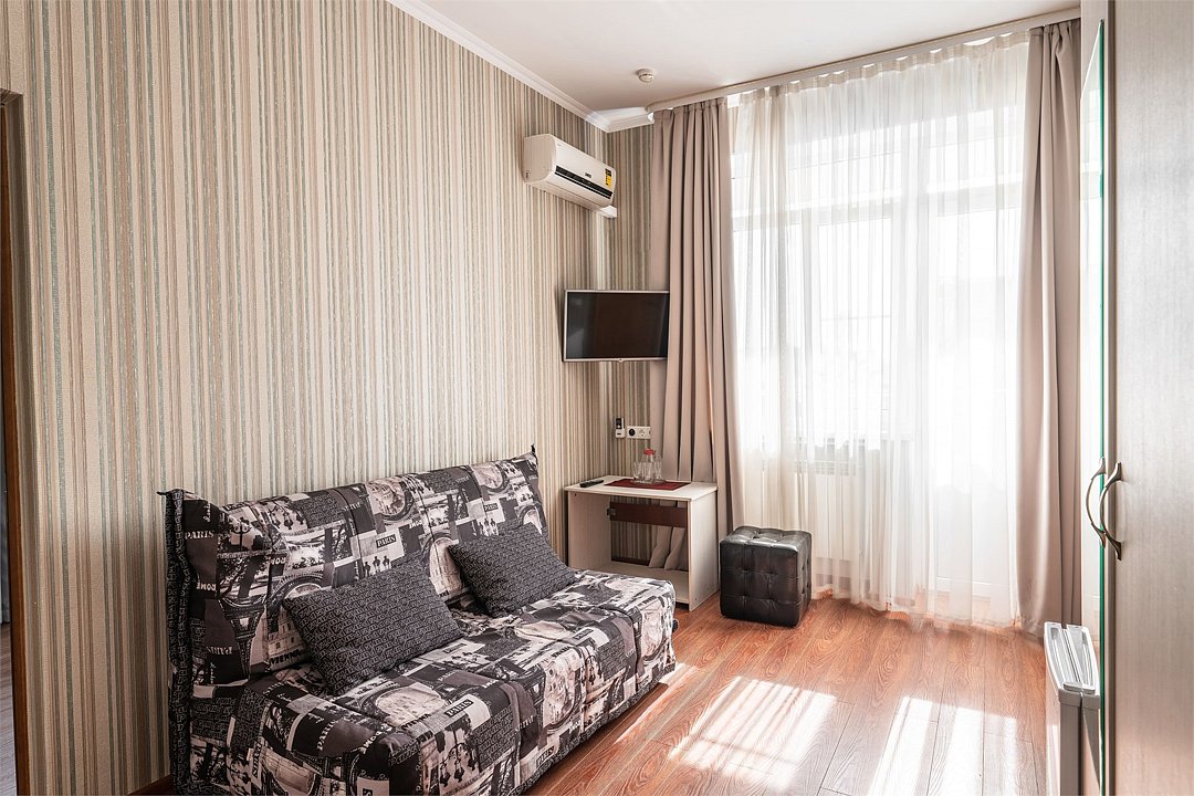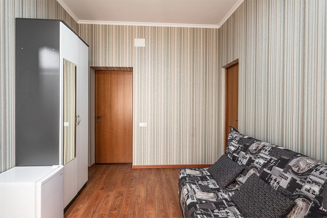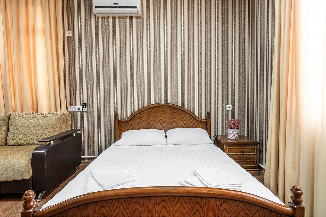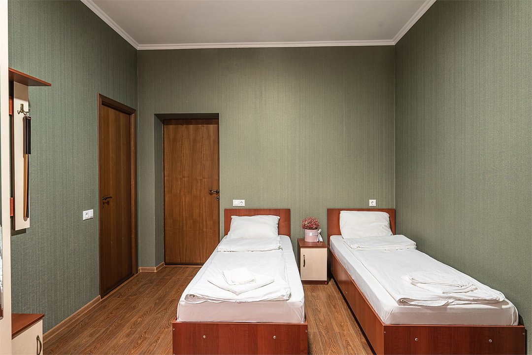 Однокомнатный номер с двумя односпальными или одной двуспальной кроватью. В номере есть кондиционер, телевизор, мини — холодильник. В санузле имеется душ. Площадь номера — 16 кв.м. В гостевом доме есть общая кухня, оборудованная всем необходимым, газовые плиты, микроволновка, чайники, посуда,холодильники и прочая кухонная утварь. Уютный двор.Услуги и удобства