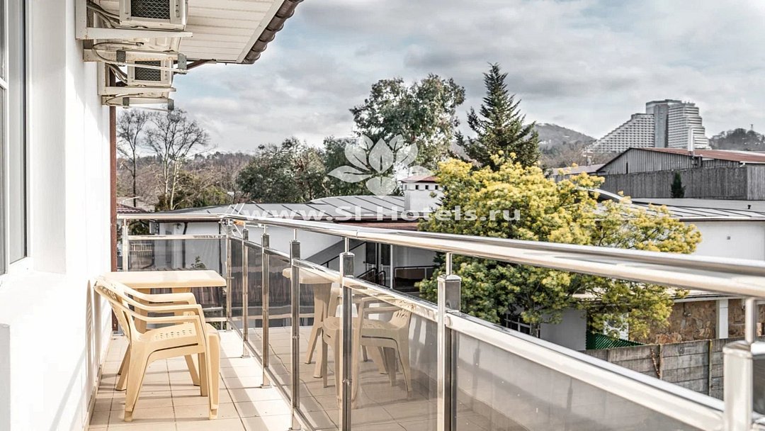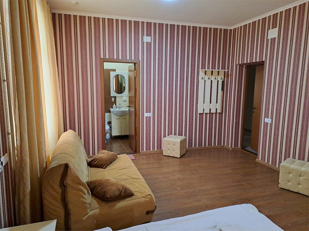 Светлый двухкомнатный номер 25 кв.м, который идеально подойдет для отдыха всей семьей. Номер укомплектован всем необходимым для полноценного отдыха: спальня с большой двуспальной кроватью, гостиная комната с диваном и пуфиками, холодильник, телевизор. Номер с балконом.Услуги и удобства