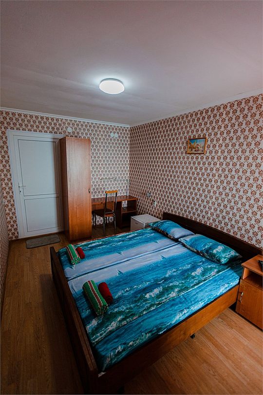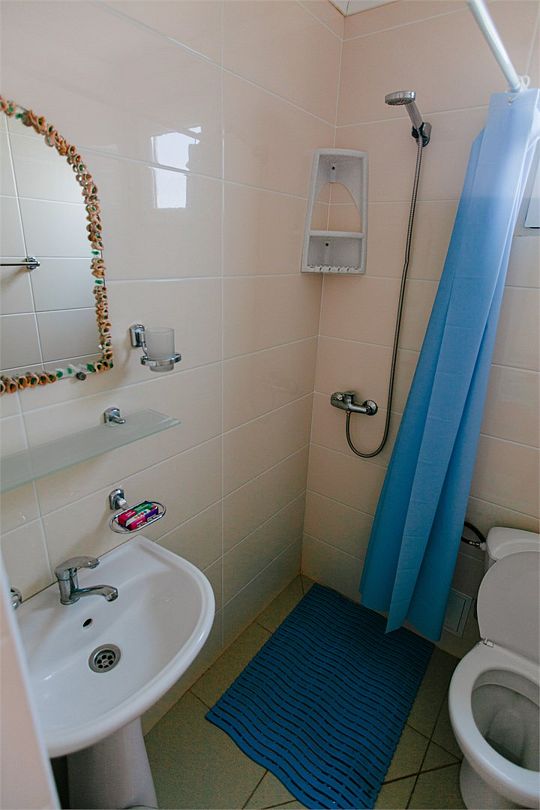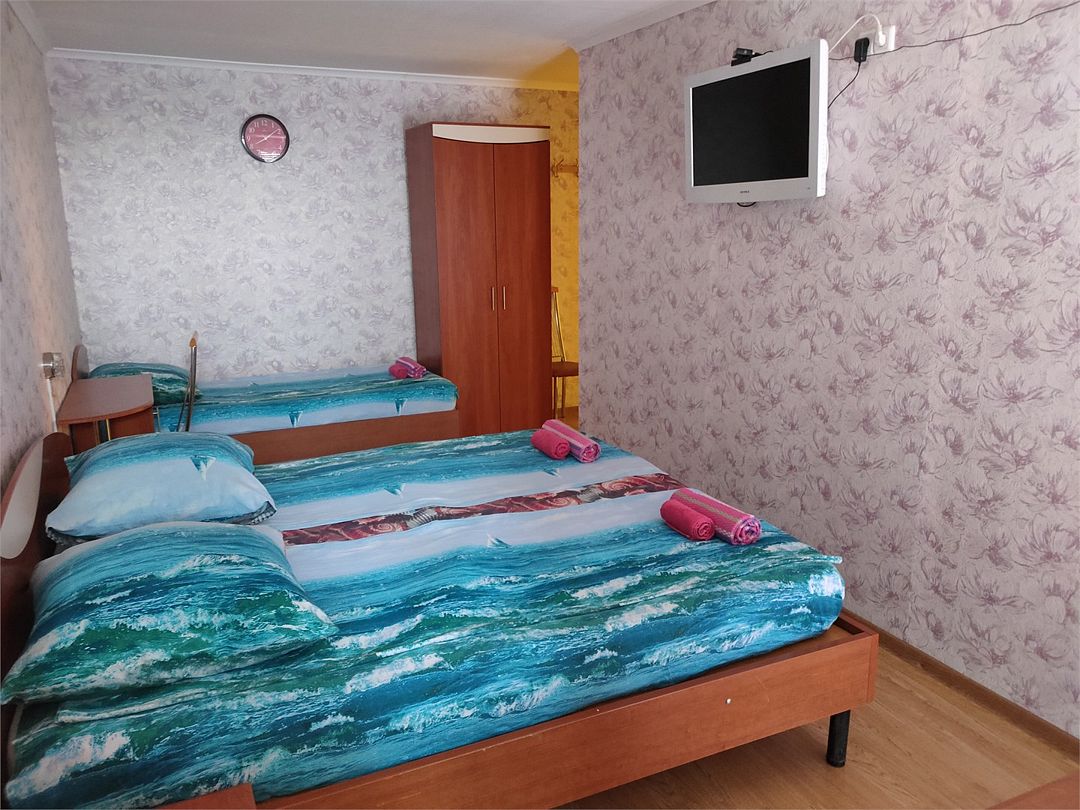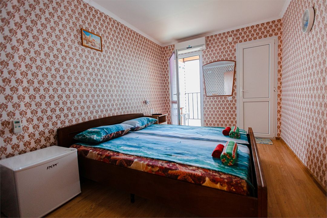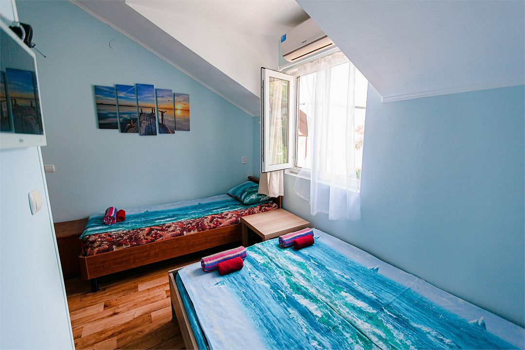 Четырехместный номер с двумя односпальными и одной двухъярусной кроватью. В номере кондиционер, балкон с видом на море, санузел с душем и туалетом, телевизор, вентилятор, стол, стулья, шкаф для одежды, тумбочки, чайник, фен. На всей территории отеля бесплатный wi-fi, парковка, место для барбекю. Общая кухня оборудована всей посудой и техникой: плита, холодильник, микроволновая печь, чайник, миксер, кофеварка, любая посуда.Услуги и удобства