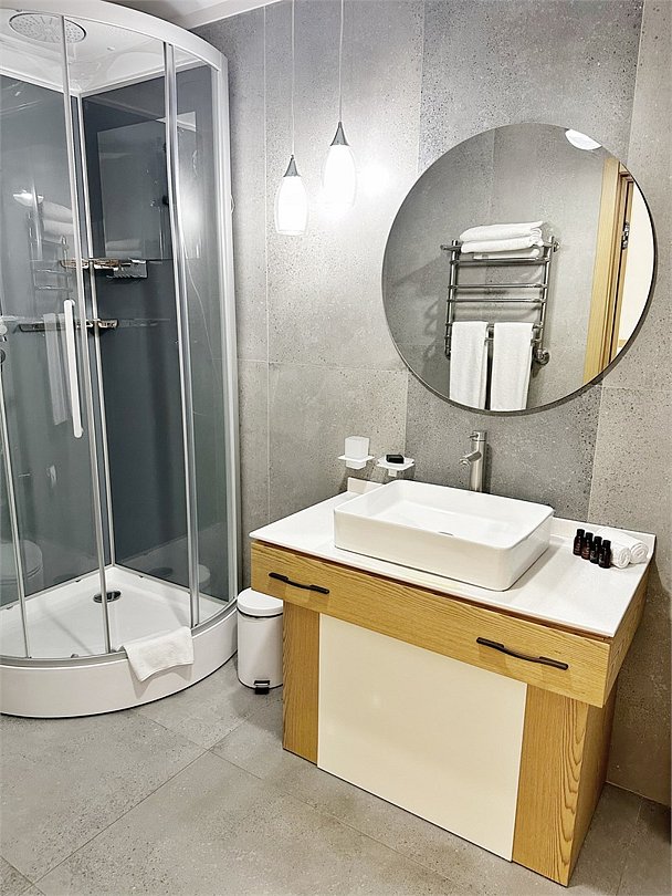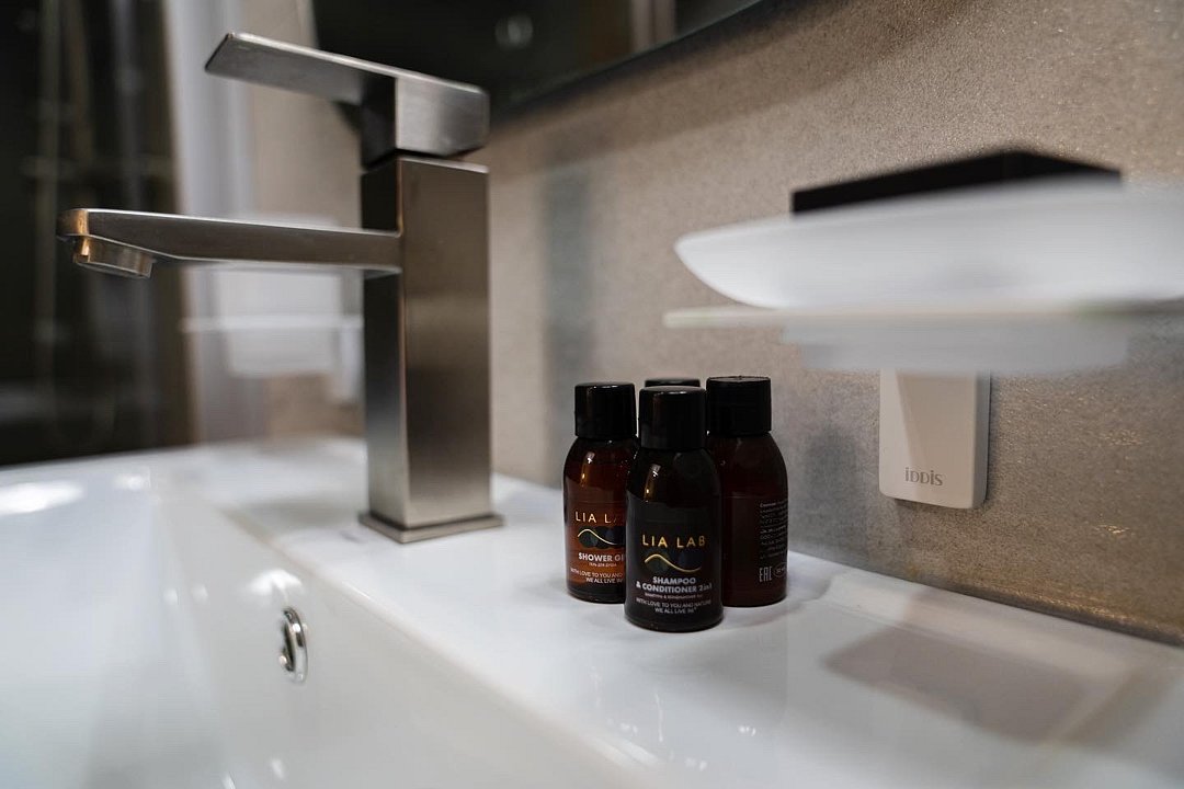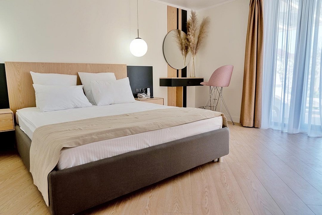 Уютный и просторный номер с кроватью queen-size - Ванная комната оснащена всем необходимым для вашего комфорта: премиальная косметика для душа, халаты для взрослых и детей, полотенца, тапочки, фен, полотенца для бассейна. - Умная колонка. - Номером можно управлять при помощи системы «Умный дом». В номере нет балкона.Услуги и удобства